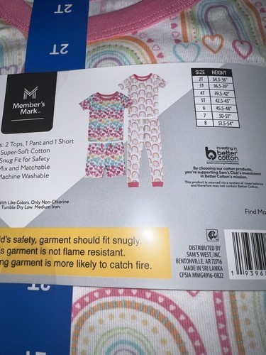 Get your little girl her favorite pajamas with this 4 piece set from Members Mark. The set includes 2 pajama tops, pants and shorts. The set features hearts and rainbow designs on a white background that your little girl will surely love. The pajamas are made of high-quality soft fabric that ensures your child's comfort while sleeping. Perfect for girls aged 2T, this set is an excellent addition to your child's sleepwear collection.