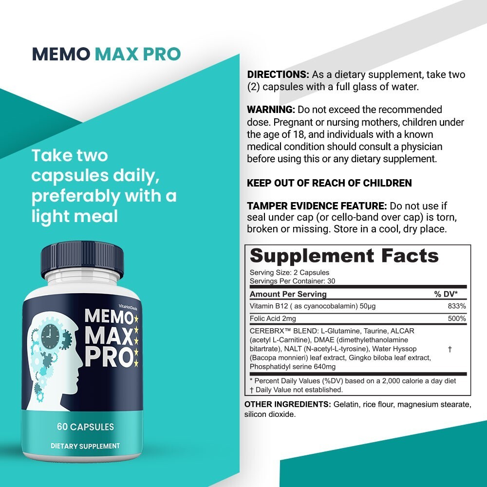 Memo Max Pro with Vitamin B12 and Folic Acid, makes caring for your brain and nerves feel easy and natural. With 60 capsules in each bottle, you?ll enjoy a full month of clarity and calm. Designed with key all-natural nutrients, these Memo MaxPro Neuro Support Pills are made for everyday wellness. Take two Memo Max Pro Capsules a day with your favorite meal and see how staying consistent helps your overall wellness feel effortless and steady.