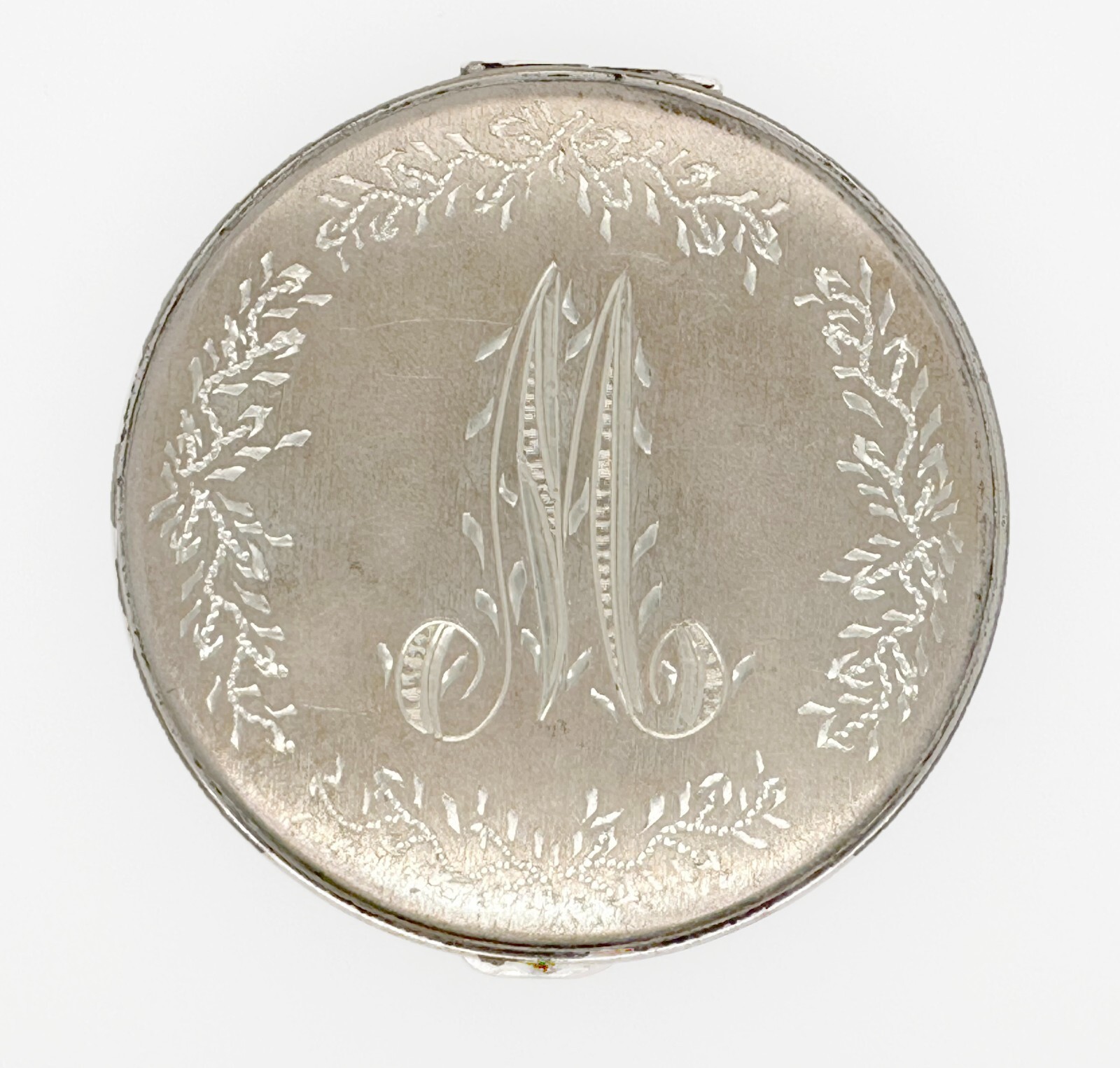 Ladies Powder Compact con specchio con il design foliato incentrato su una singola "M"