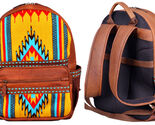Challenger western backpack made from supple genuine full-grain leather to endure everyday use. Bag comes accented with a unique handwoven saddle rug multiclor pattern. This lightweight versatile bag is ideal for school, work, traveling, weekend trips, daypacking, or the great outdoors. Conveniently sized fits most airline overhead bins for a carry-on option. Includes adjustable padded for comfort shoulder straps. Top full zipper closure main pocket comes fully lined. Inside has one side zippered pocket, two open compartments for organized storage. The antique finish brass hardware beautifully ties the bag together.?