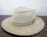 Men’s - estimated size Medium - Mesh Vented Tan Brown Australian Safari Hat Tobwabba Art Aussie Outback style. Nice clean condition, a little glue marks from manufacture around the top rim, one would have to look closely to notice. A few spots and marks underside of the brim. Mesh is intact and not tattered or abused. One owner family item. I do not know if the manufacturer is Tobwabba, I think it's just in reference to the wonderful art around the band of the hat. There is no fabric label but it feels like suede leather. There is no size, the EXTERIOR measurement is 24", interior with flexible ruler tape is approx 23". Please measure a hat you have on hand for a good fit!