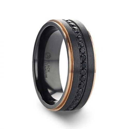 - Men’s Black Titanium Wedding Band with Black Sapphire Channel & Rose Gold Edges