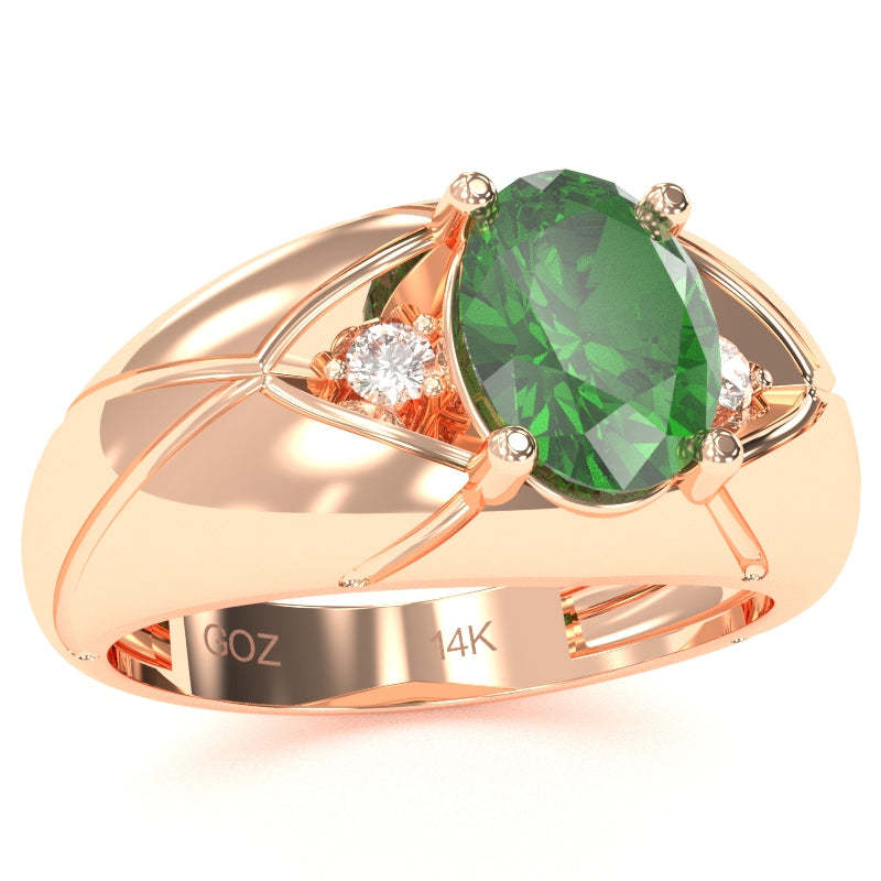 Treat yourself or your partner to a very cool, symmetrical shapes designer lab-created emerald and diamond ring. This men's ring is crafted in solid 14k rose gold with an oval center stone surrounded by 2 bright diamonds with distinct symmetrical groves on all sides of the ring. A matching women's ring is available exclusively at Gems Of Zodiac!