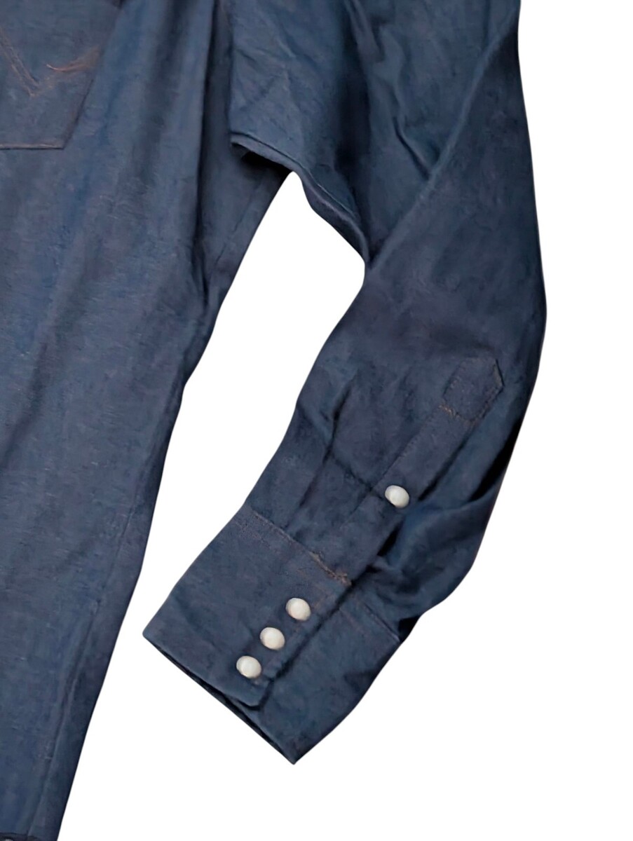 This is a denim blue color with pearl buttons. Front buttoned Pockets. From the shoulder to the very bottom hem measures 35 in. This is a very long shirt. Made of heavy duty denim like material. Flat across the chest from armpit to armpit measures approximately 28 in