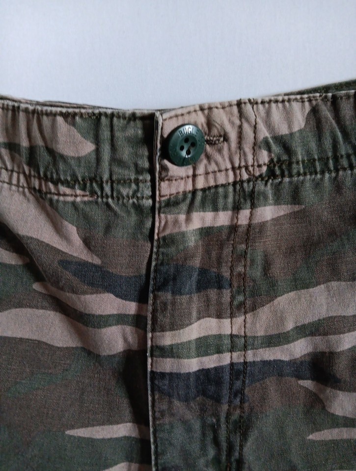 These Men's Bugle Boy Cargo Camo shorts in size 36 are perfect for a casual or workwear look. The green camouflage pattern adds a rugged outdoor touch, while the 6 pockets provide functionality. Made from a blend of cotton and algodon, these shorts feature a button closure and regular fit. Ideal for a comfortable and stylish summer wardrobe option. Normal wear.