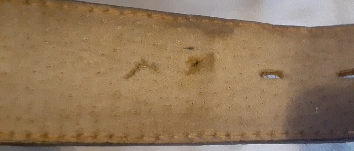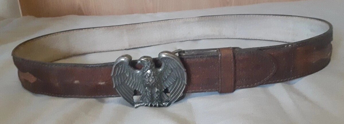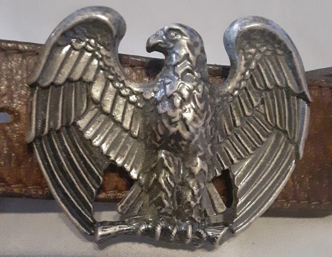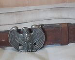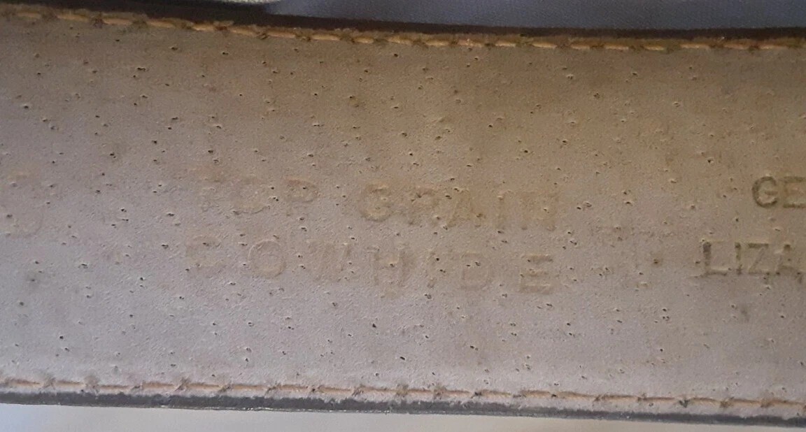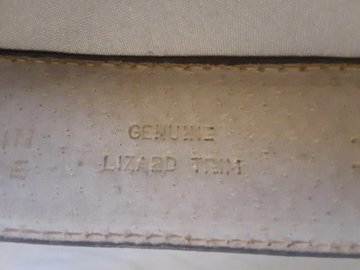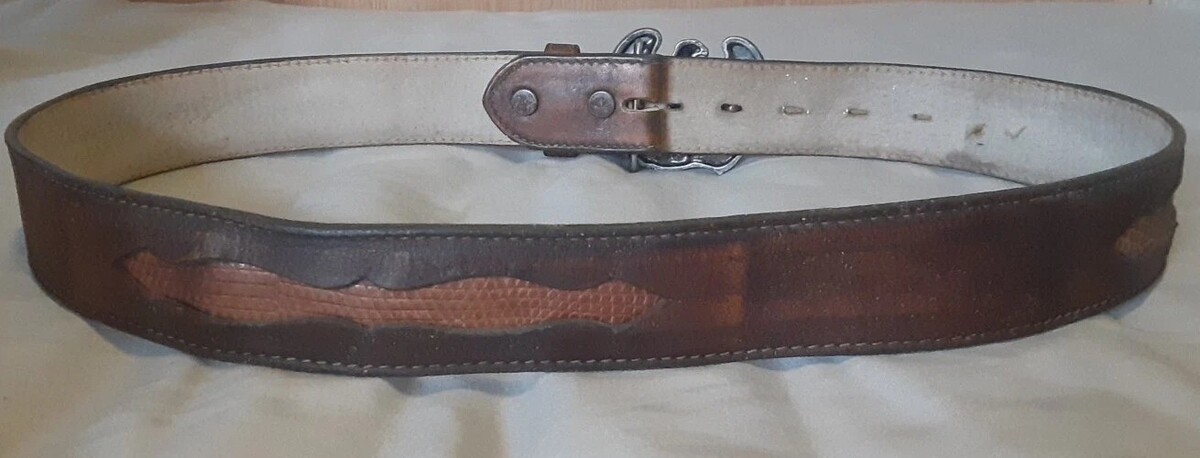 Mens Leather Belt Lizard Trim With Eagle Buckle Size 32" x 1 1/2" wide. There are 2 holes that have been put in the belt by the previous owner (not done professionally). There is wear. This is a stiff leather. Please see pictures for exact condition.