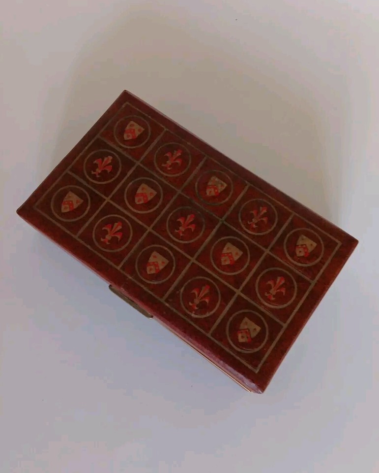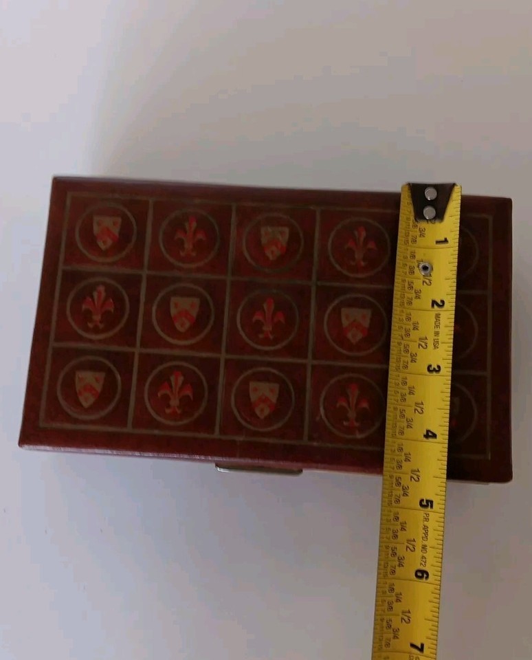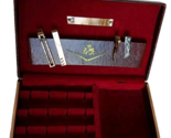 This vintage jewelry box is a must-have for any collector. Handcrafted in the United States approximately in the 1960s, this men's jewelry box features 4 unique tie clips and is made of high-quality leather. Measuring at 7.5 inches in length, it is the perfect size to store all your favorite accessories. The box has been beautifully hand-painted and hand-tufted, making it a unique one-of-a-kind piece. It is perfect for anyone who loves vintage, retro, or mid-century items. Add it to your collection today and enjoy the timeless beauty that it brings to any room. This is a vintage item with normal wear. See Pictures