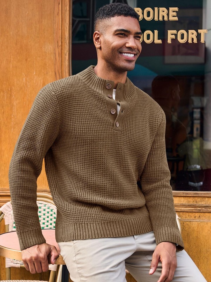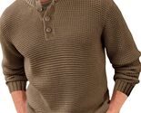 - Mens Waffle Knit Pullover Sweater Quarter Button Stand Collar Brown Size XL