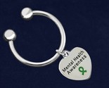 This mental health awareness key chain is a silver heart charm with a green ribbon charm and the words "Mental Health Awareness" on a horseshoe style key ring. The key ring is approximately 1 1/2 inches in diameter and theribbon charm is approximately 5/8 inch by 5/8 inch. This sterling silver plated key chain comes in a bag.