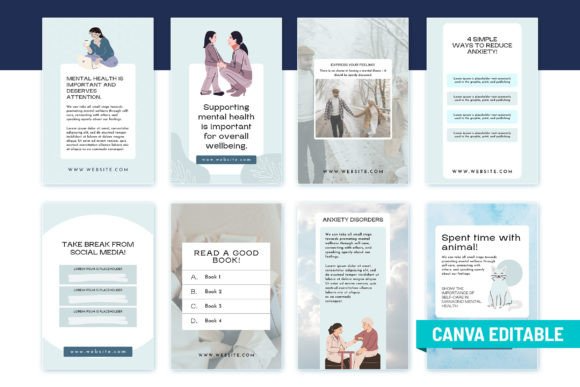 Featuring visuals specifically designed to draw attention and inspire readers, each template can easily be edited on Canva’s online platform. Great for posting on topics ranging from anxiety relief advice to therapy tips — these