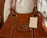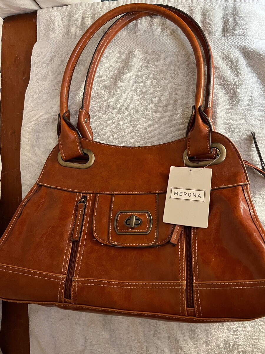 This Merona satchel bag is a stylish addition to any outfit. With a spacious interior and top handle, it's perfect for carrying all your essentials. The exterior is a beautiful brown color with black lining, making it versatile for any occasion. The bag is labeled as a large size and is perfect for women who love to carry a lot with them. It's a great addition to any collection and perfect for any fashion-forward woman.