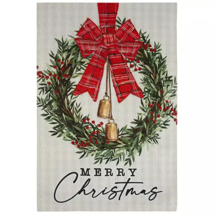 Give your guests a warm holiday greeting with this Merry Christmas Wreath Garden Flag. This flag features a faint gingham background and has a lush wreath in the center. The wreath is decorated with a plaid ribbon, gold bells, and red berries. Beneath the wreath is the phrase "Merry Christmas" in simple black font. Display this in your entryway for a rustic addition to your home.