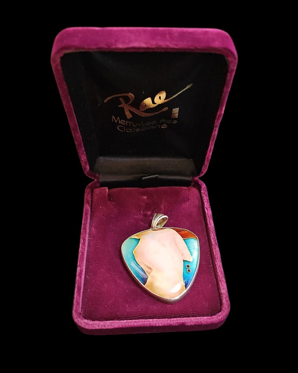 UP FOR SALE: Stunning original cloisonne enamel pendant by renowned American enamel artist Merry-Lee Rae. This piece is believed to be part of her Mermaid Study era ? Rae is known for creating preparatory mermaid figure studies which later evolved into her full exhibition works. Similar unset enamel study pieces sell for $350?$600 directly from the artist. This example is a fully finished pendant set in sterling silver and is signed Rae.