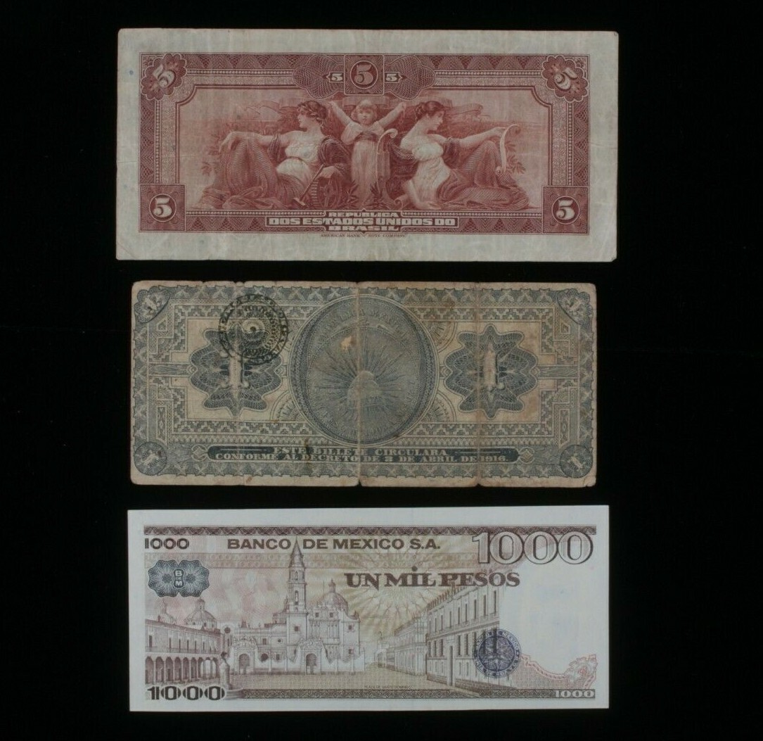 Lotto di 3 banconote Messico e Brasile // 1-1000 pesos messicani e 5 cruzeiros brasiliani