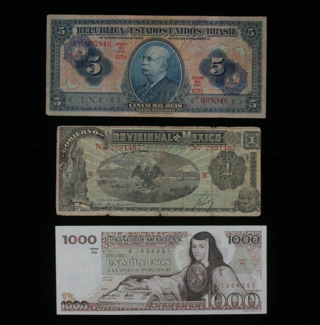 Messico Brasile 3-Notes Lotto Messicano 1-1000 Pesos Brasiliano 5 Cruzeiros