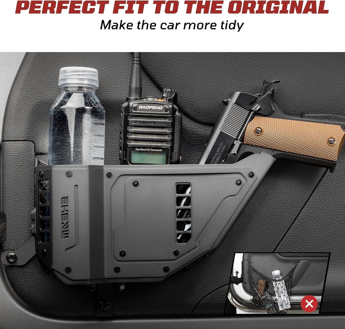 ??Excellent Quality Design?The Wrangler door storage is made of high-quality sheet metal parts. Compared to plastic storage boxes, the metal ones are more sturdy and textured. The protruding front panel is perfect for water bottles or similar items. Partial metal mesh Provide external storage for your tools, pager, pocket knife, holster, other daily gear. This door-side storage organizer box takes the rough style into design and makes your vehicle cool.