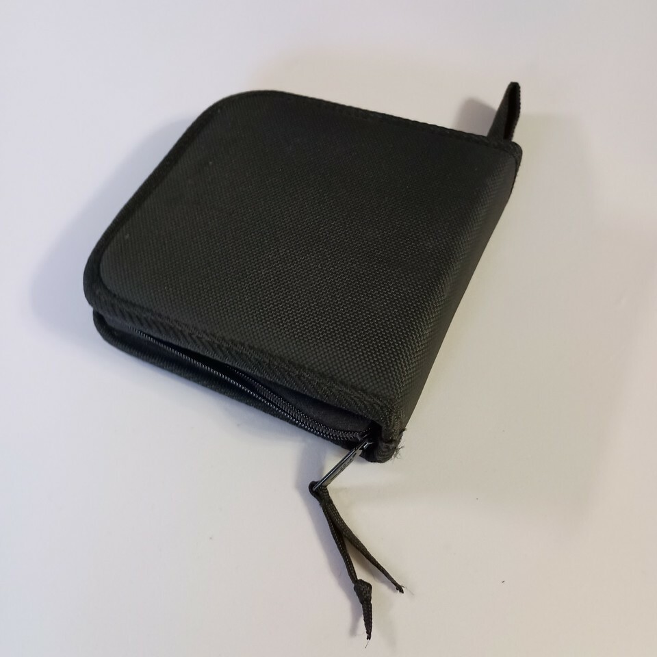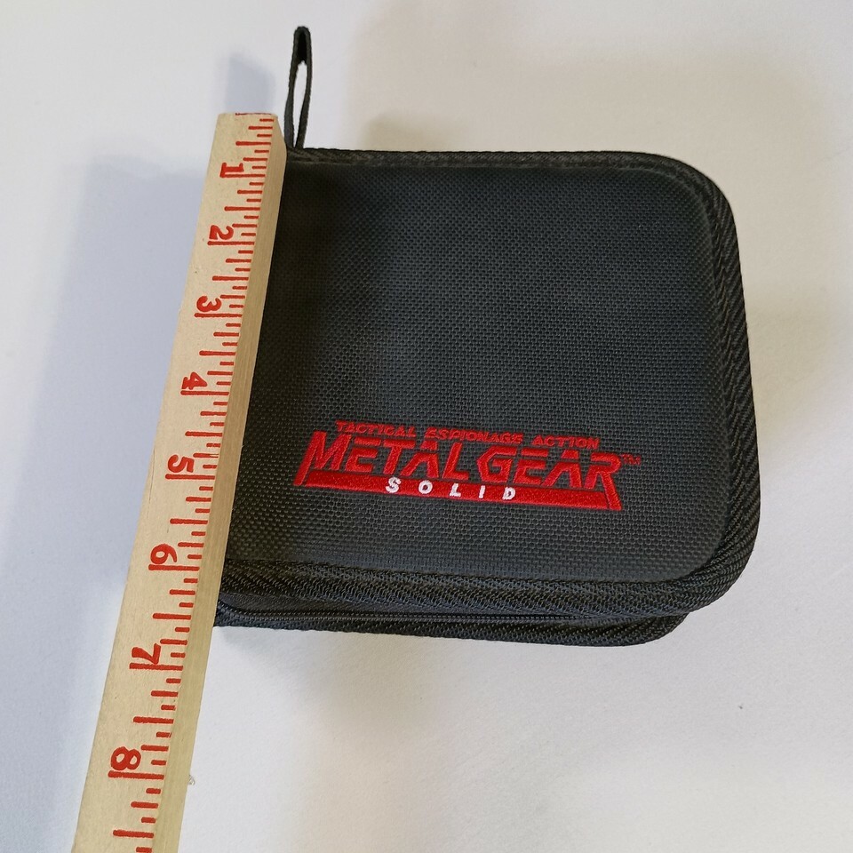 The Metal Gear Solid Tactical Espionage Action CD Case is a sleek and durable carry case made of nylon in a matte black color. Designed specifically to hold up to 12 CD's, DVD's, and Blu-ray discs, this compact and portable case is perfect for on-the-go entertainment. The Metal Gear brand adds a touch of authenticity to this functional and stylish accessory. Perfect for fans of the Metal Gear Solid series or anyone looking for a reliable storage solution for their media collection. Normal wear.