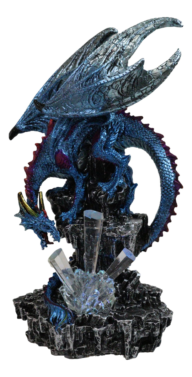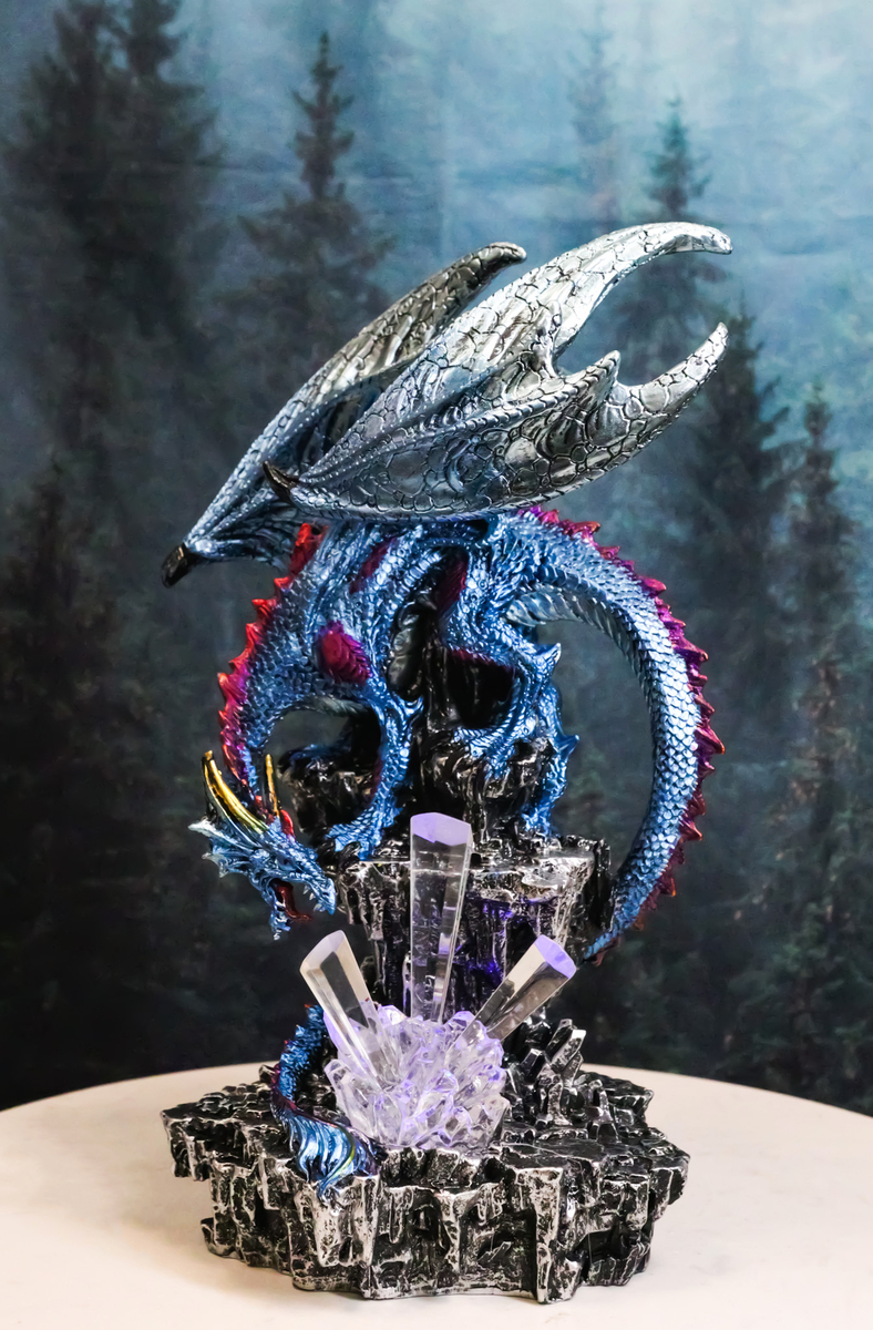 ? Illuminate your space with the Blue Dragon Guarding Crystals Figurine. This captivating piece features a fierce dragon in shimmering blue hues with vivid magenta spikes, protectively encircling glowing ice-like crystal formations powered by LED light. Radiant and dramatic, it brings a touch of fantasy and power to any room. Perfect for dragon collectors, fantasy decor lovers, or as a dazzling statement piece that captures mythical elegance and strength.