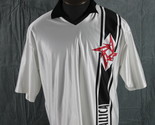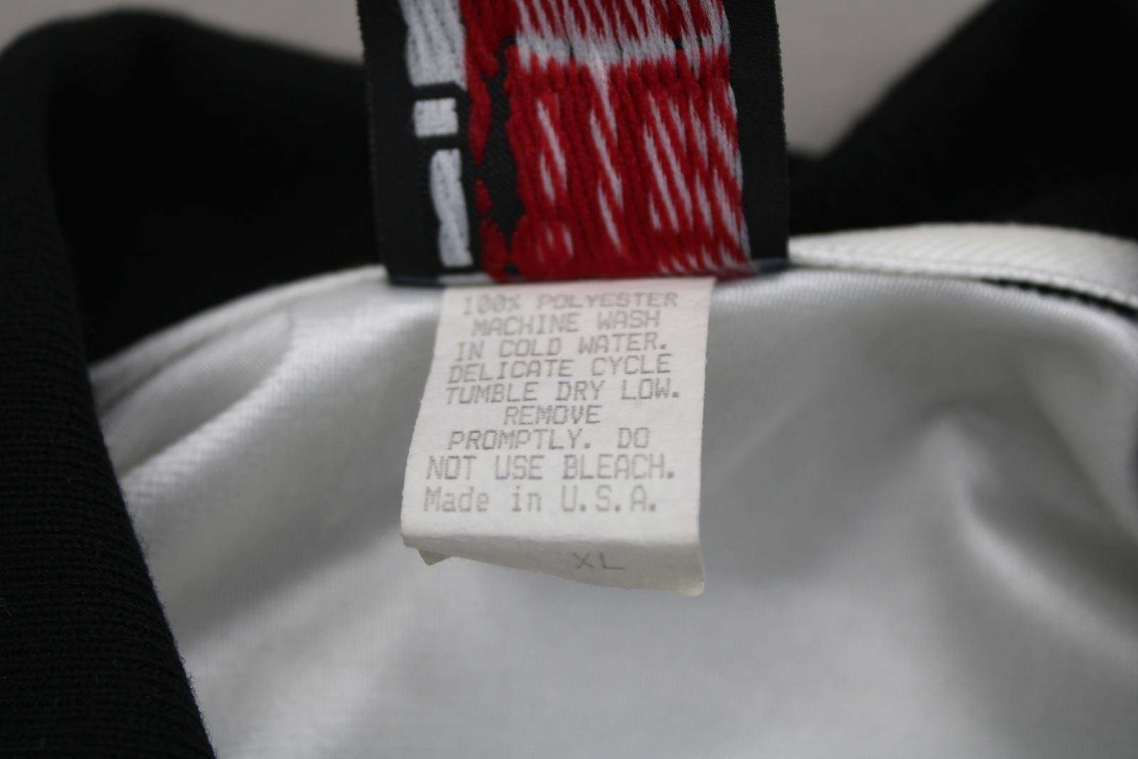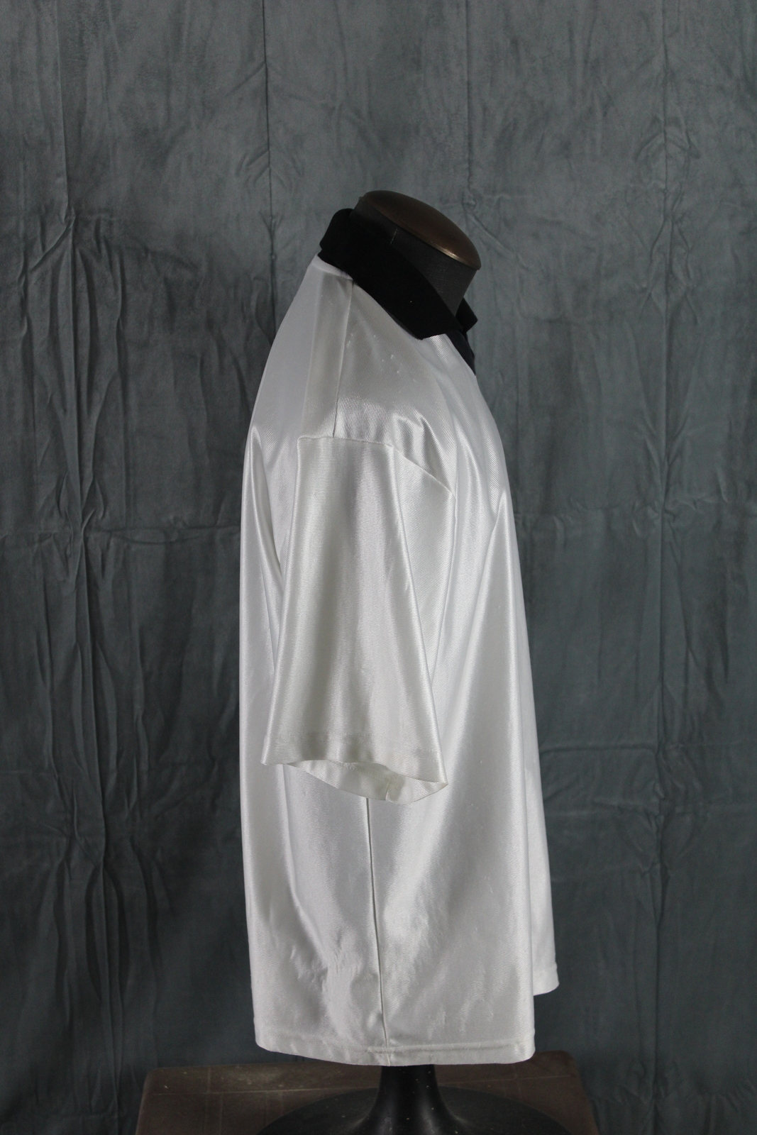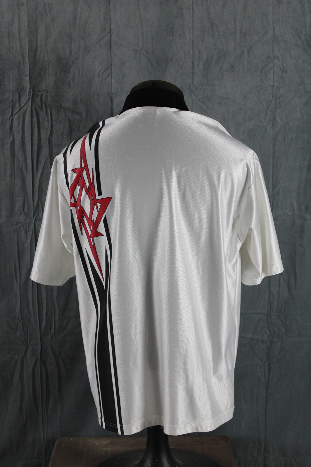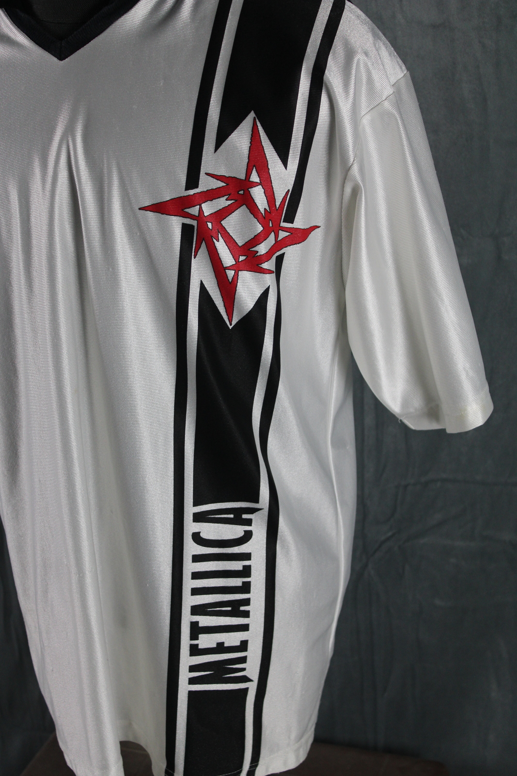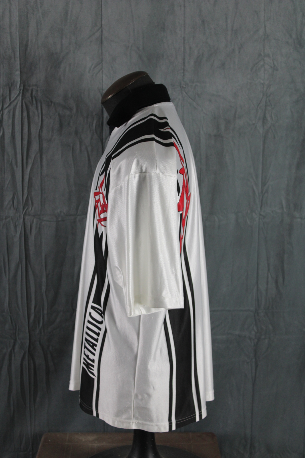 Up for sale is a vintage Metallica soccer jersey by Giant. It has a white base with a black trim and collar. The left side of the shirt has a racing stripe done in red in black with the Metallica M star logo on it and Metallica underneath. The stripe runs from the back to the front of the jersey. What an amazing jersey, do not miss out on it.