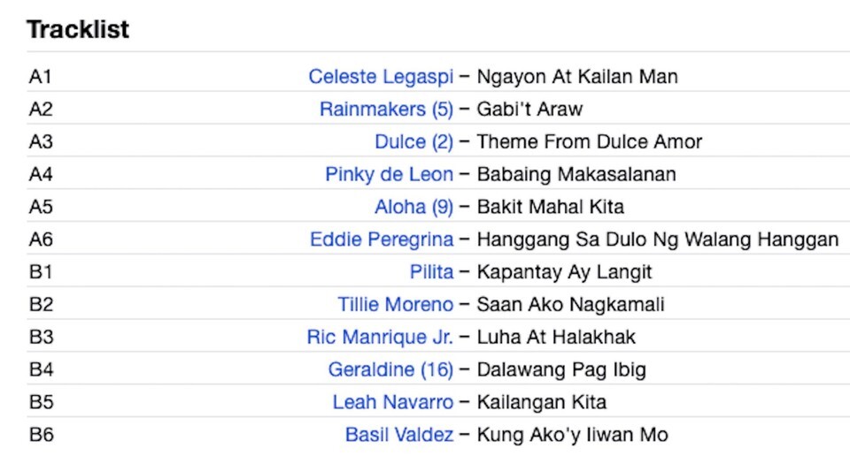 SIDE A. NOW AND WHENEVER Celeste Legaspi NIGHT DAY Rainmakers THEME FROM DULCE AMOR Dulce SINFUL WOMAN Pinky de Leon WHY DO I LOVE YOU Aloha