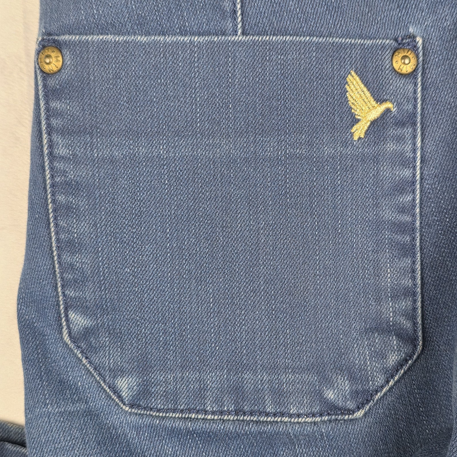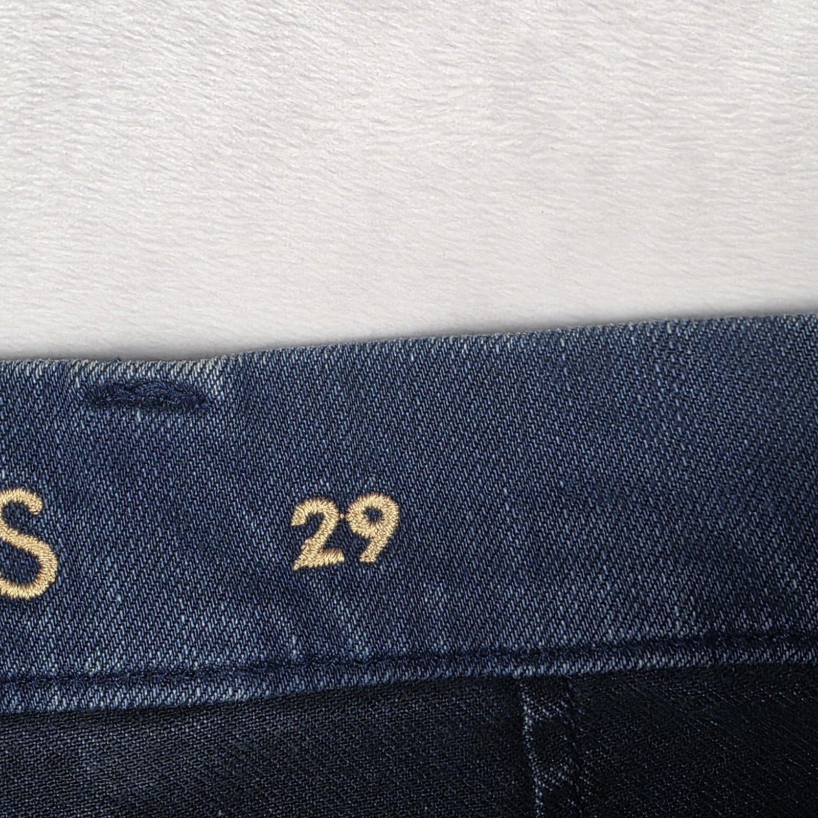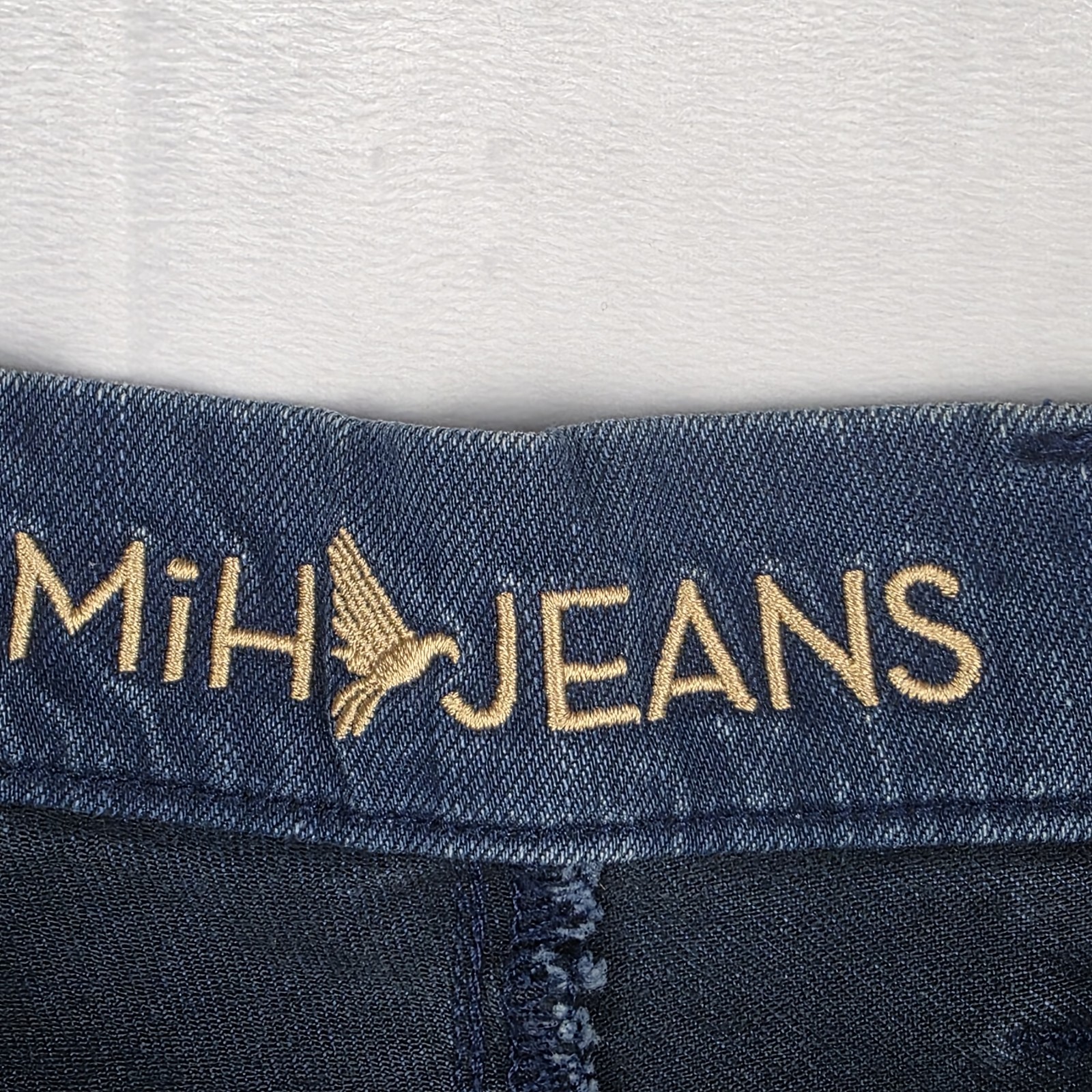 MiH Jeans Women's Size 29 The Marrakesh Mid Rise Kick Flare Christie Blue Denim is a stylish pair of denim jeans with a solid pattern and dark fabric wash. These jeans feature a mid-rise fit and flared style, perfect for a retro hippie look. Made with a blend of spandex and cotton, these jeans are comfortable, stretchy, and easy to care for with machine washable instructions. The jeans also include accents like buttons, zippers, and the MiH logo, with pockets for added functionality. Ideal for all seasons, these jeans are a versatile addition to any fashion-forward wardrobe.