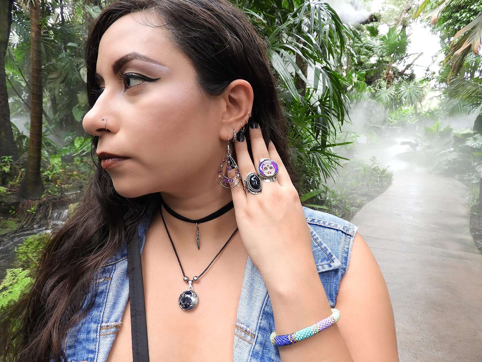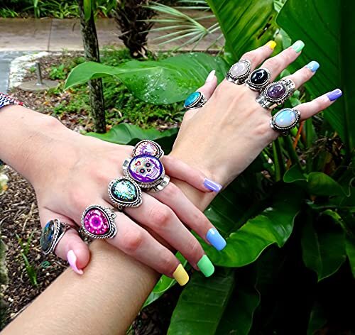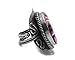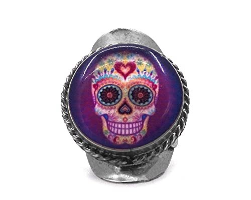 Product description: Round-shaped acrylic Day of the Dead sugar skull graphic design on alpaca silver metal ring with rope edge border.