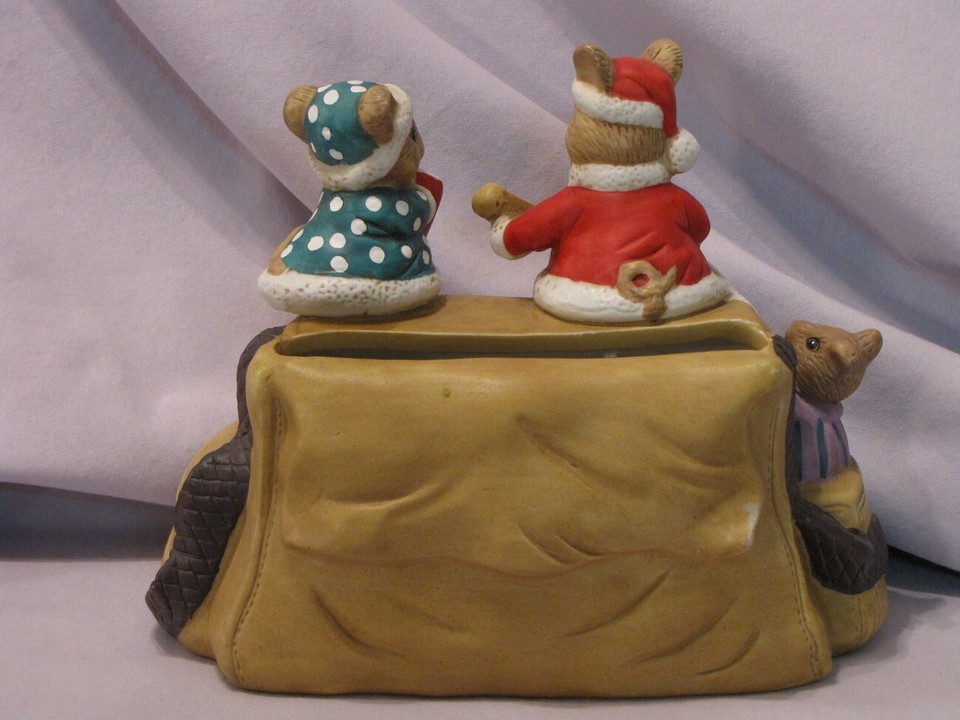Offered for your buying pleasure is an adorable ceramic Mice Christmas Mail Holder. The item has three mice sitting on a mail bag. There is a slot in the back of the item to hold cards and/or envelopes. The bottom has Transfap Int'l Corp etched on the bottom. This item is in excellent condition with no chips or cracks. It measures 7" x 8 1/2" x 4. I do offer a discount on combined shipping. If you want to purchase more than one item, contact me with the items and I can give you the exact amount of the shipping before you make your payment.