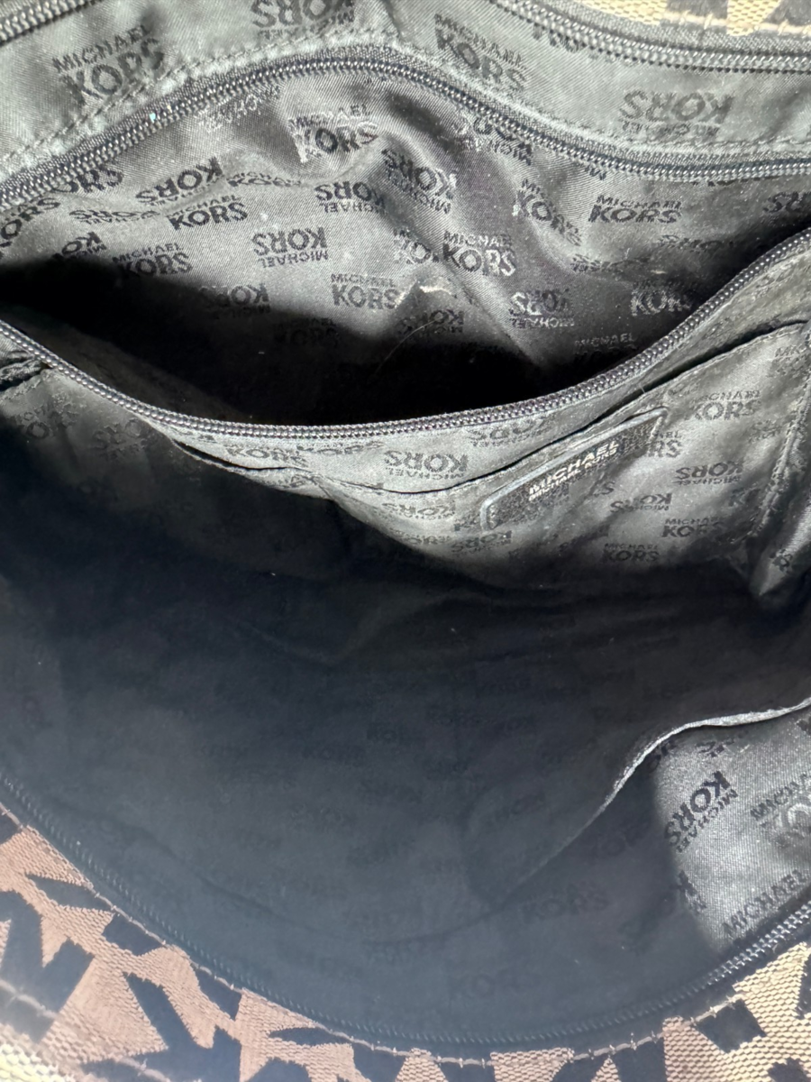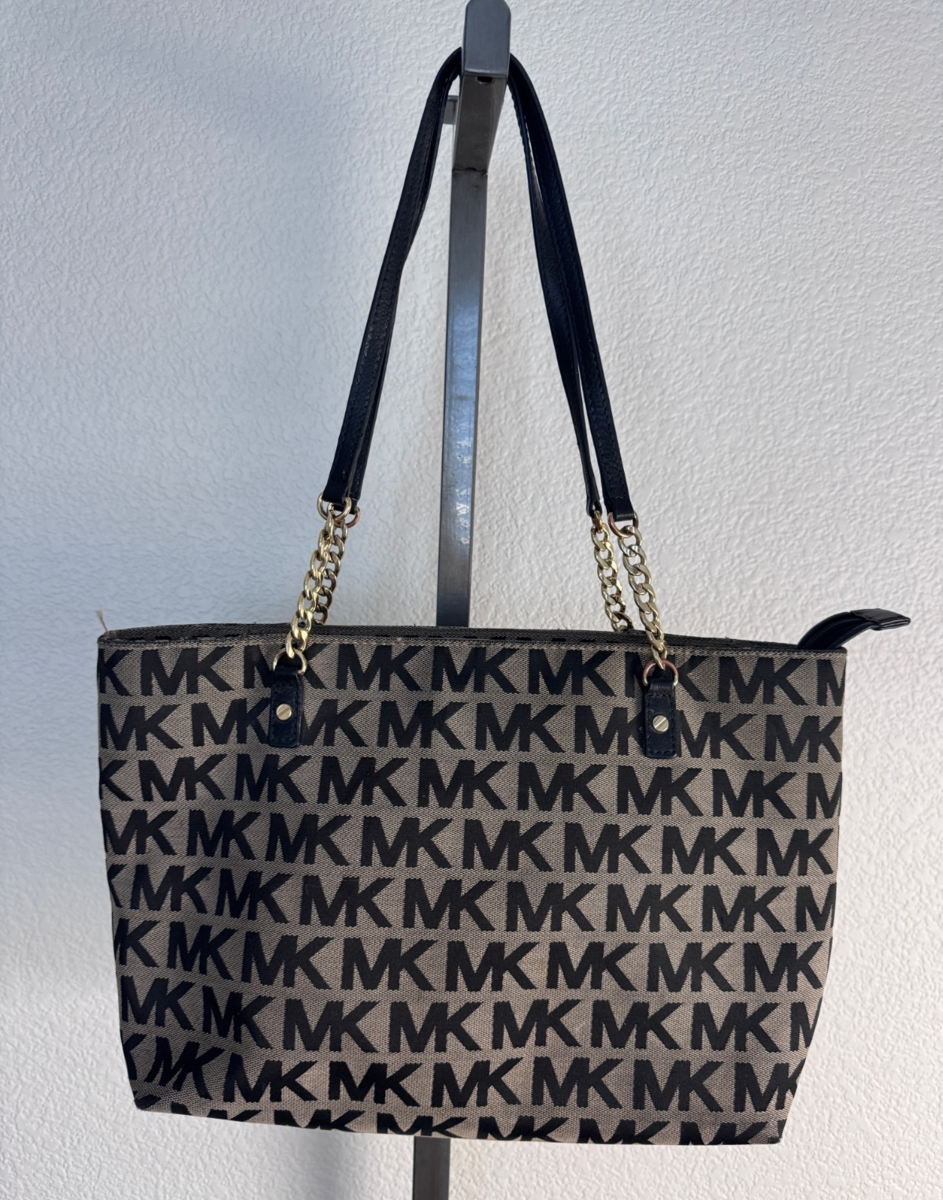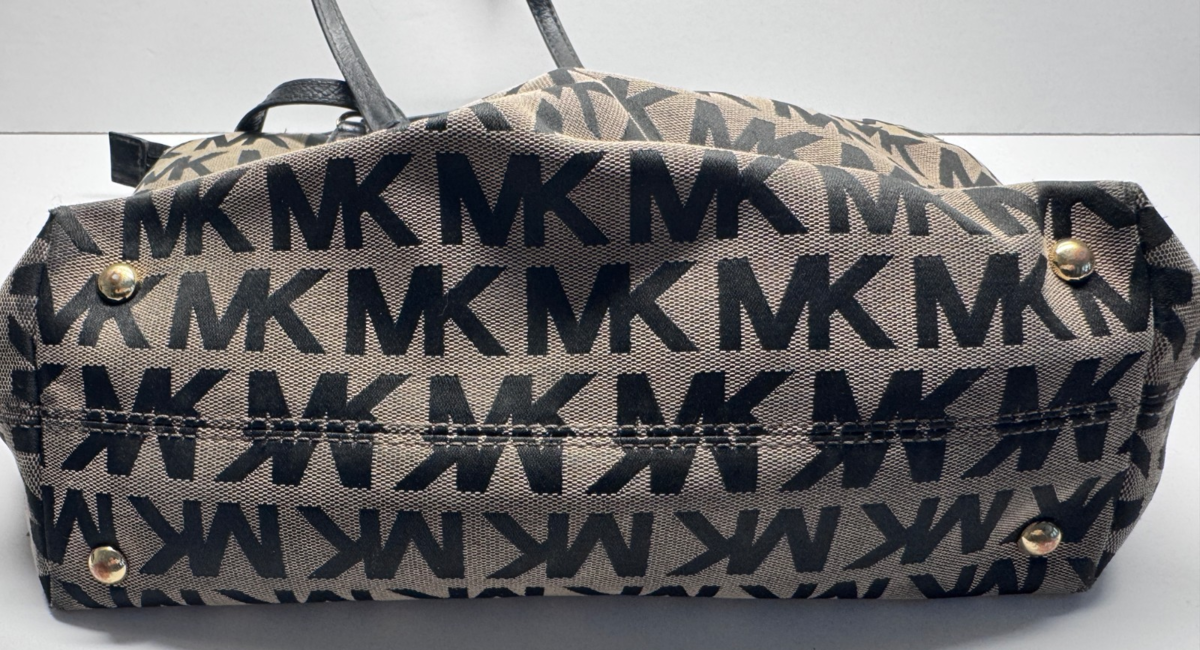 - Michael Kors Jet Set Travel Large Logo Jet Set Signature Tote Bag Tan And Black