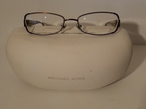 Up for sale is a used pair of Michael Kors MRK436 Eyeglass Frame with prescription lenses with white Kors Case.