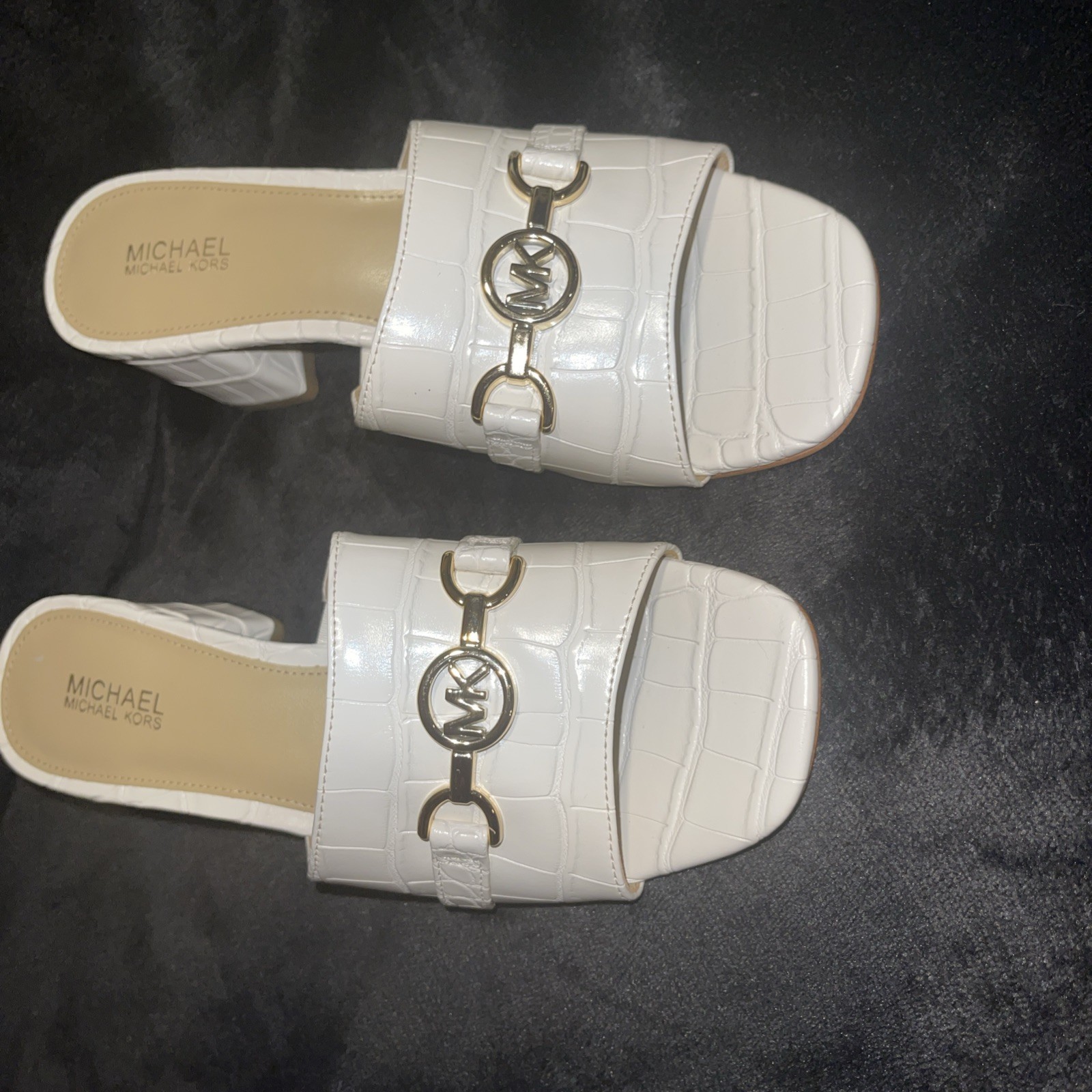 - MICHAEL KORS WHITE CROCK BLOCKED HEEL SLIP-ON SANDALS MK LOGO SIZE 8.5 NEW $195