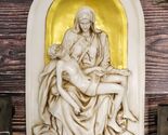 ? The original work of Michelangelo La Pieta is reproduced and redesigned into a shrine wall decor in 3D. Mother Mary carries the body of her Son Jesus Christ in lamentation and behind her is a gold background to signify the purity of her love.