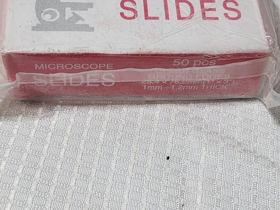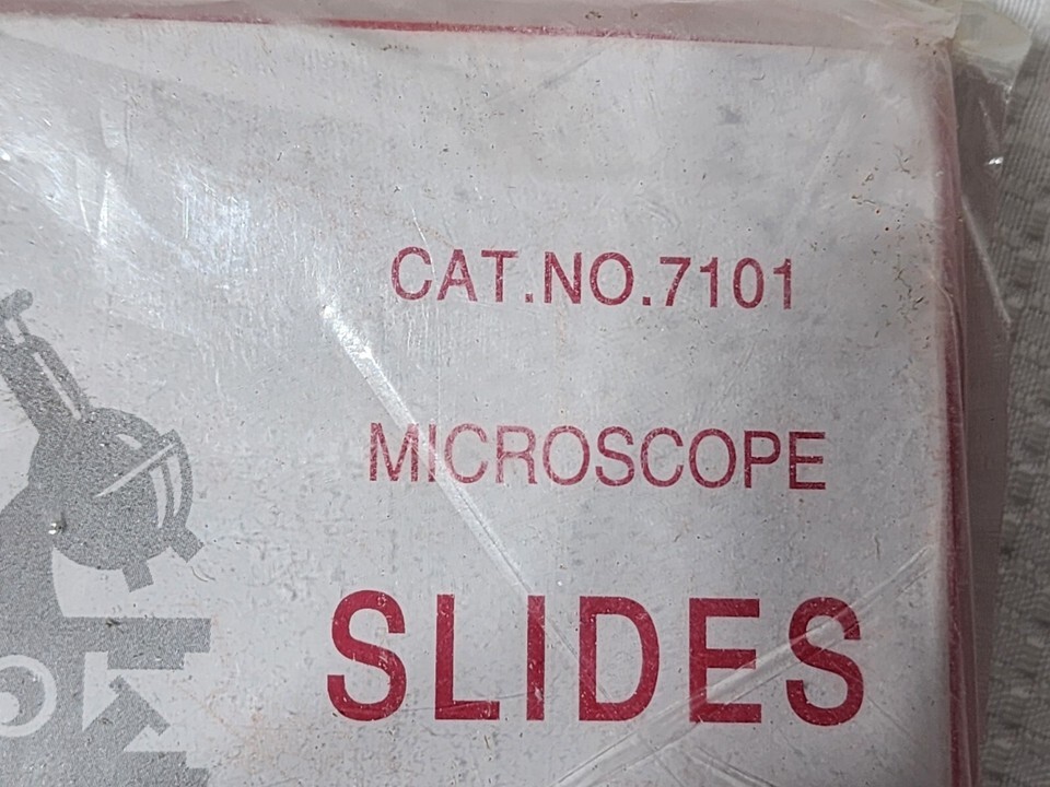 Description of item: The product image shows a sealed package of microscope slides labeled "Microscope Slides" with a catalog number 7101. These slides are designed for laboratory use, featuring clear glass with ground edges, each measuring 25.4 x 76.2 mm and 1 mm to 1.2 mm in thickness. The pack includes 50 pieces and is marketed for its quality and precision for scientific applications. The barcode and additional details suggest the product is new, ensuring reliability for various microscopy tasks.