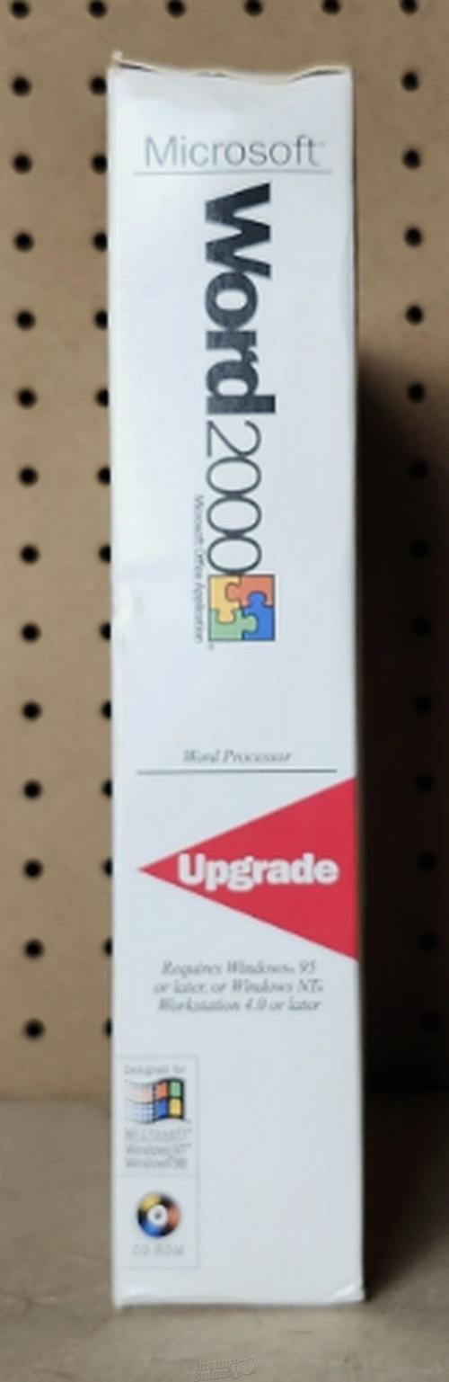 Microsoft Word 2000 Upgrade Windows 95 or later Microsoft Office Word Processor Acceptable condition box. a few folds. Disk and other papers in good condition. Not fully sure it includes every paper, but it includes CD, manual, registration card, EULA paper, and office update paper. Product key on CD case. All paperwork in great condition.