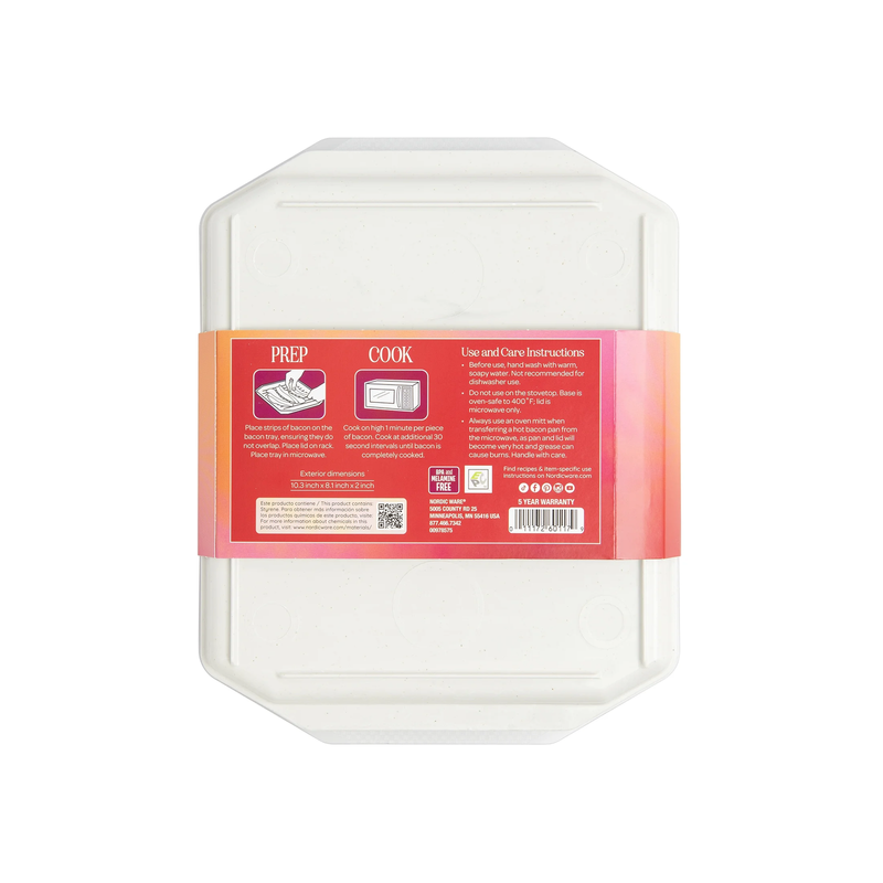 Nordic Ware Microwave Safe Covered Bacon Rack with Lid in White Plastic with Lid. Prevent the greasy mess of making bacon the traditional way by using the Nordic Ware covered bacon rack in the microwave for mess free and quick cooking. The covered bacon rack has a compact design that fits in even the smallest microwaves. The clear lid prevents messy splatters and the ribbed design elevates food above the drippings so the grease flows away. Great for cooking bacon, sausage, hot dogs as well as heating leftovers and defrosting foods. This is made from BPA and Melamine free plastic.