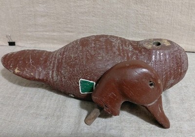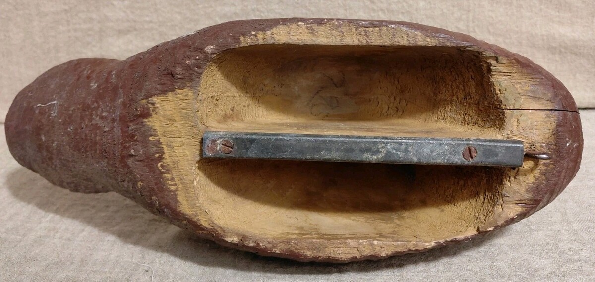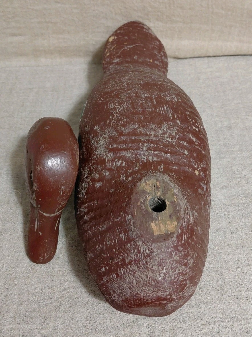 It's hand-carved from wood (likely balsa or cedar, based on the lightweight hollow construction and texture), with a uniform brown paint job that's worn and chipped from age and use?typical for working decoys rather than purely decorative ones.