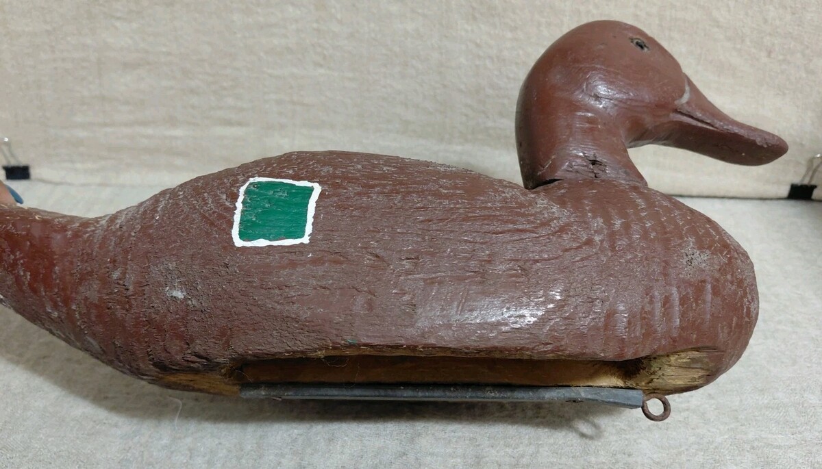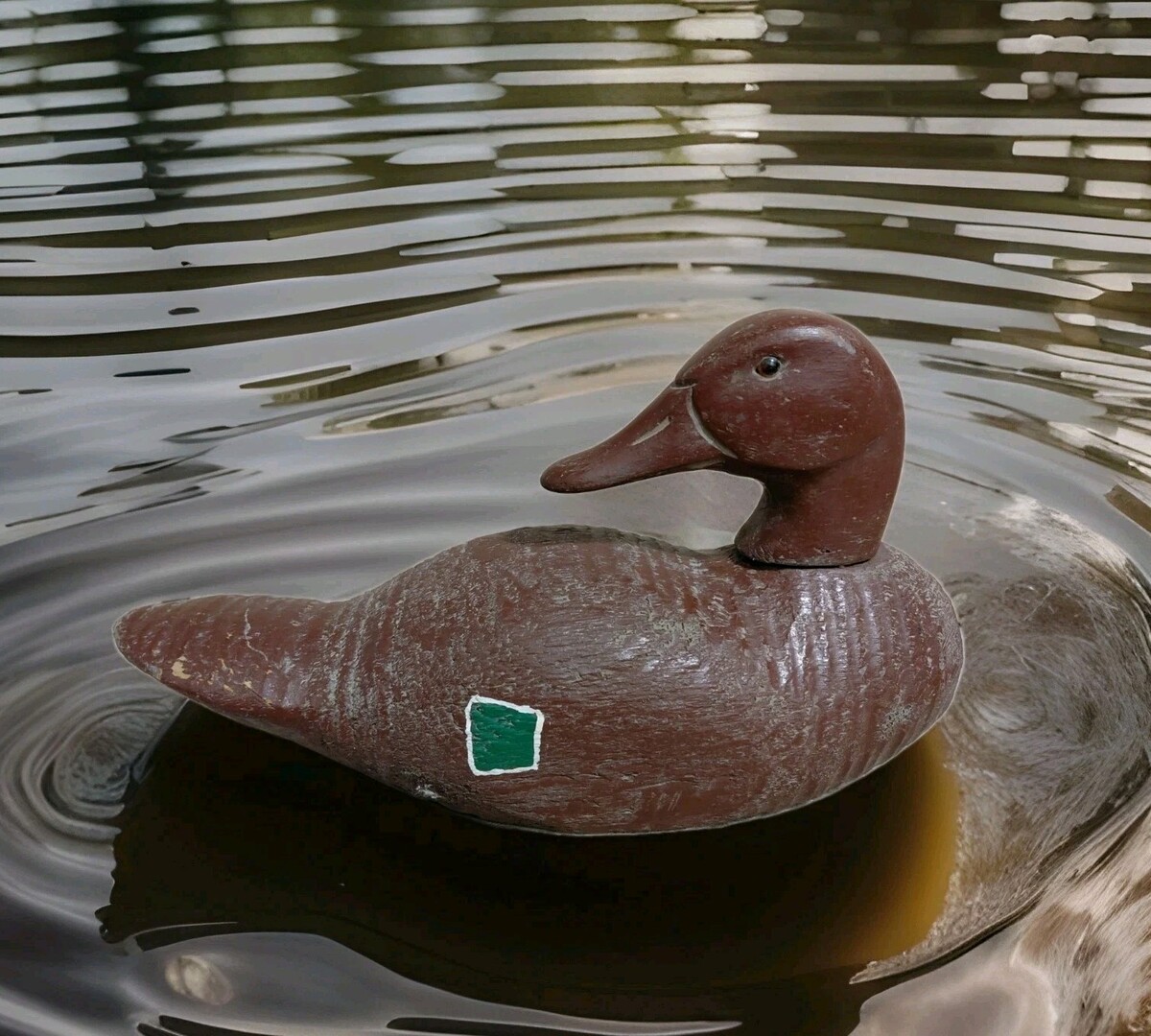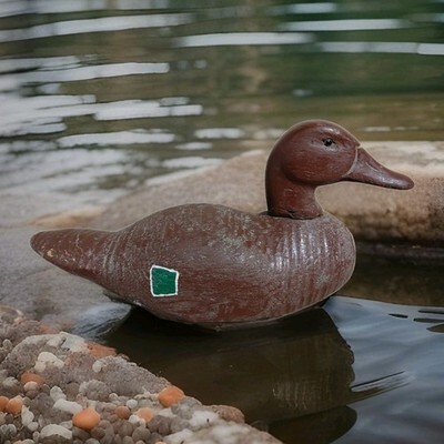 Here we have a vintage wooden duck decoy, specifically modeled after a mallard hen (female mallard duck and traditionally used in waterfowl hunting to attract live ducks by mimicking a resting or feeding bird on the water.
