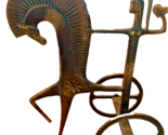 The vintage Mid Century Modern Bronze Etruscan Horse/Chariot Sculpture stands at 10.5 inches tall, featuring an abstract design of Athena (with owl) on the chariot.