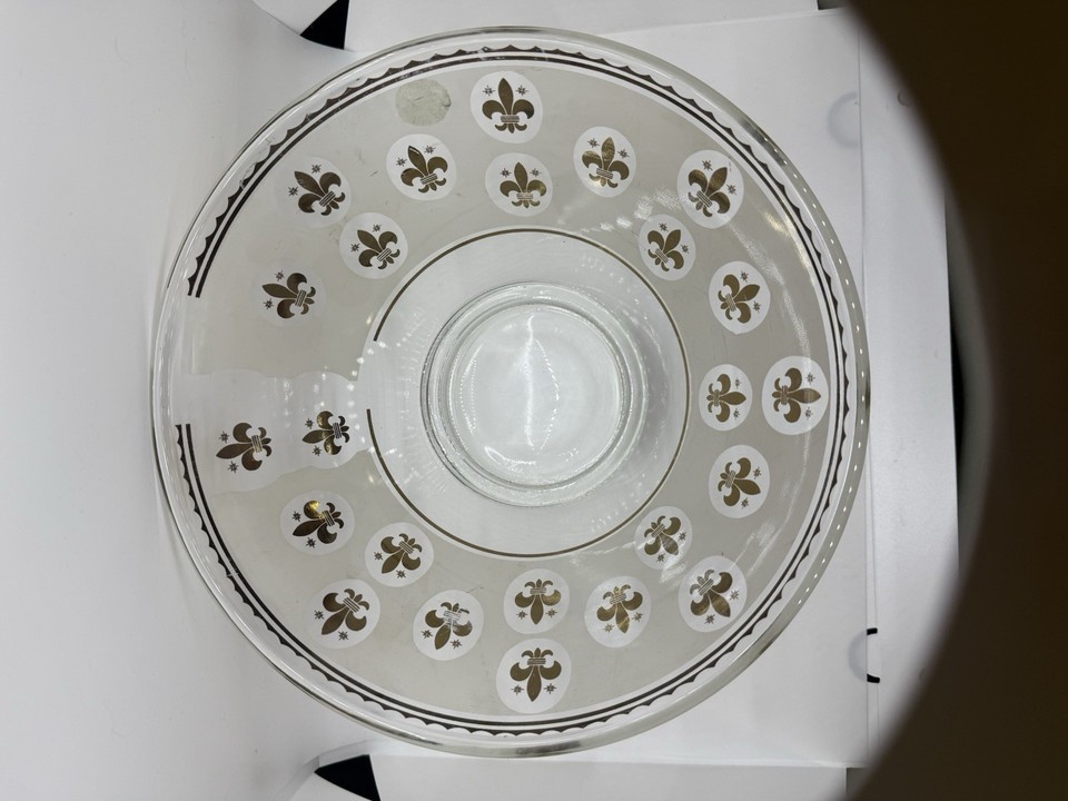 Add a touch of mid-century elegance to your home with this striking glass serving bowl, decorated in shimmering gold fleur-de-lis medallions against a frosted band. A scalloped gilt trim circles the rim, catching the light beautifully and lending a bit of Hollywood Regency glamour.