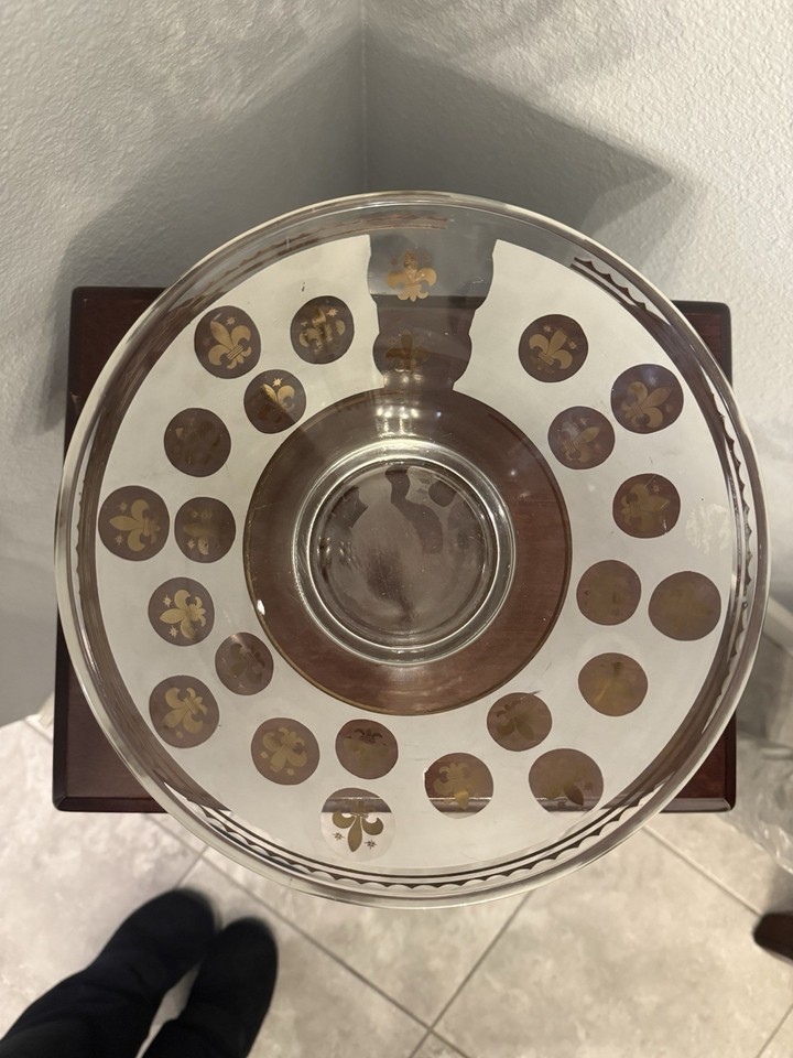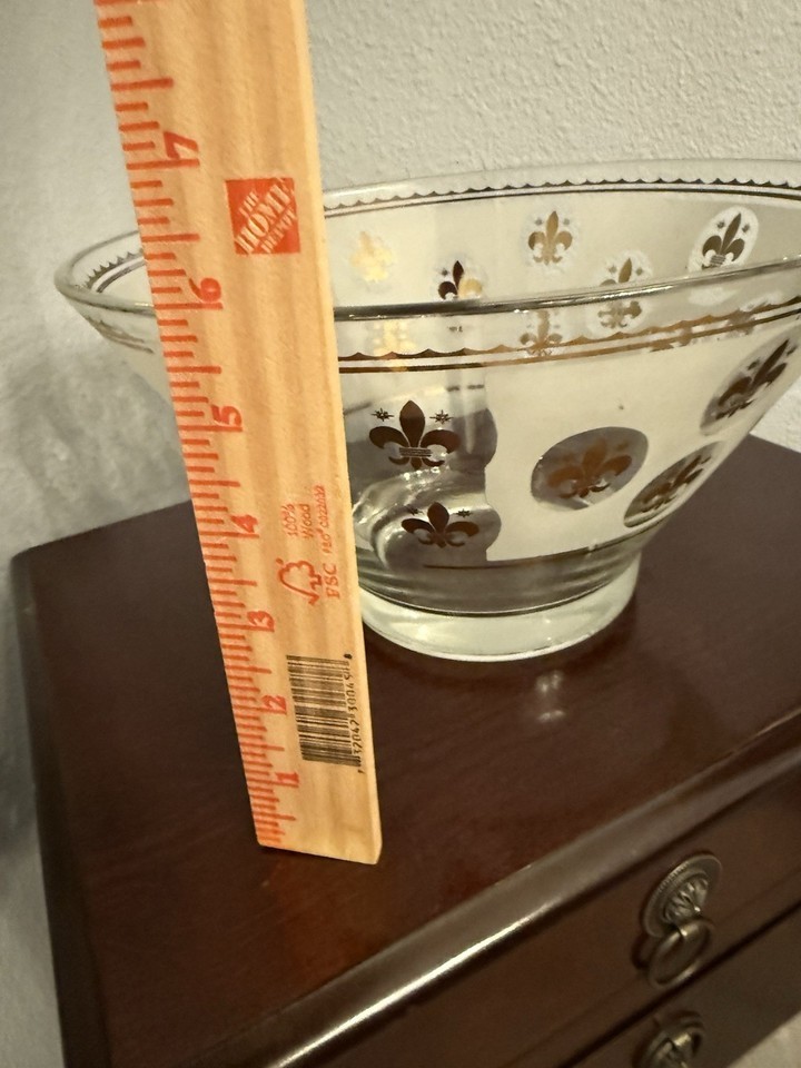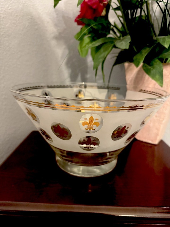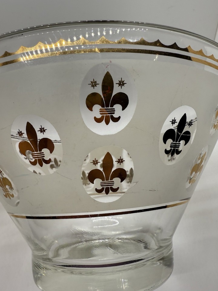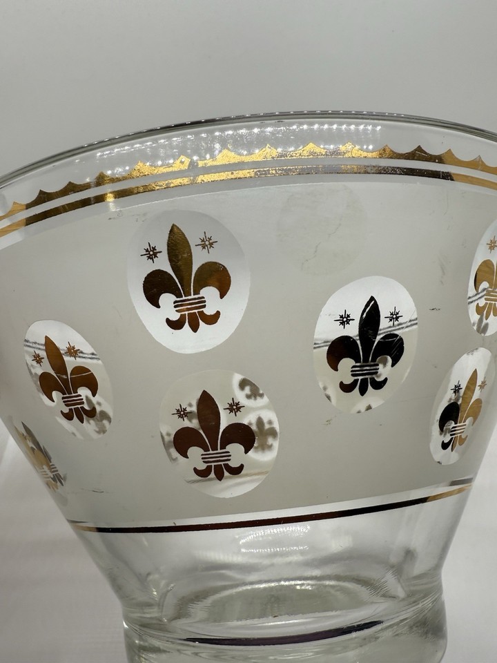 - Mid Century Glass Bowl Frosted Gold Fleur de Lis Barware Decor MCM