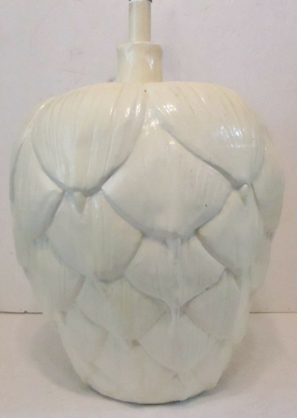 Mid-Century Modern sculptural white artichoke table lamp. This large ceramic lamp features a white painted finish and sculptural artichoke leaves. In the style of Chapman Lighting. There is not an included lampshade. The socket and switch have been newly replaced.