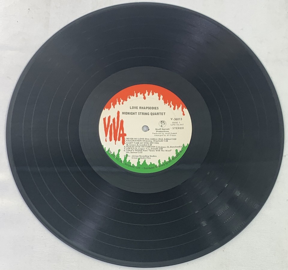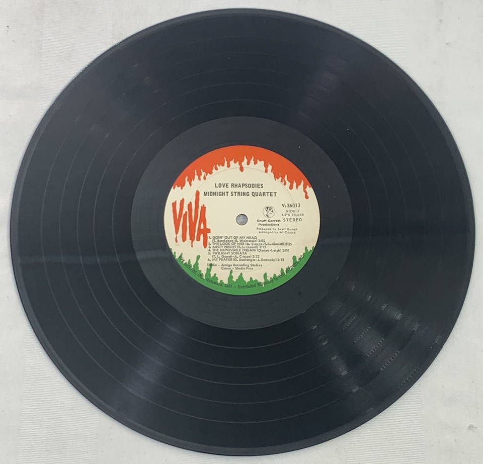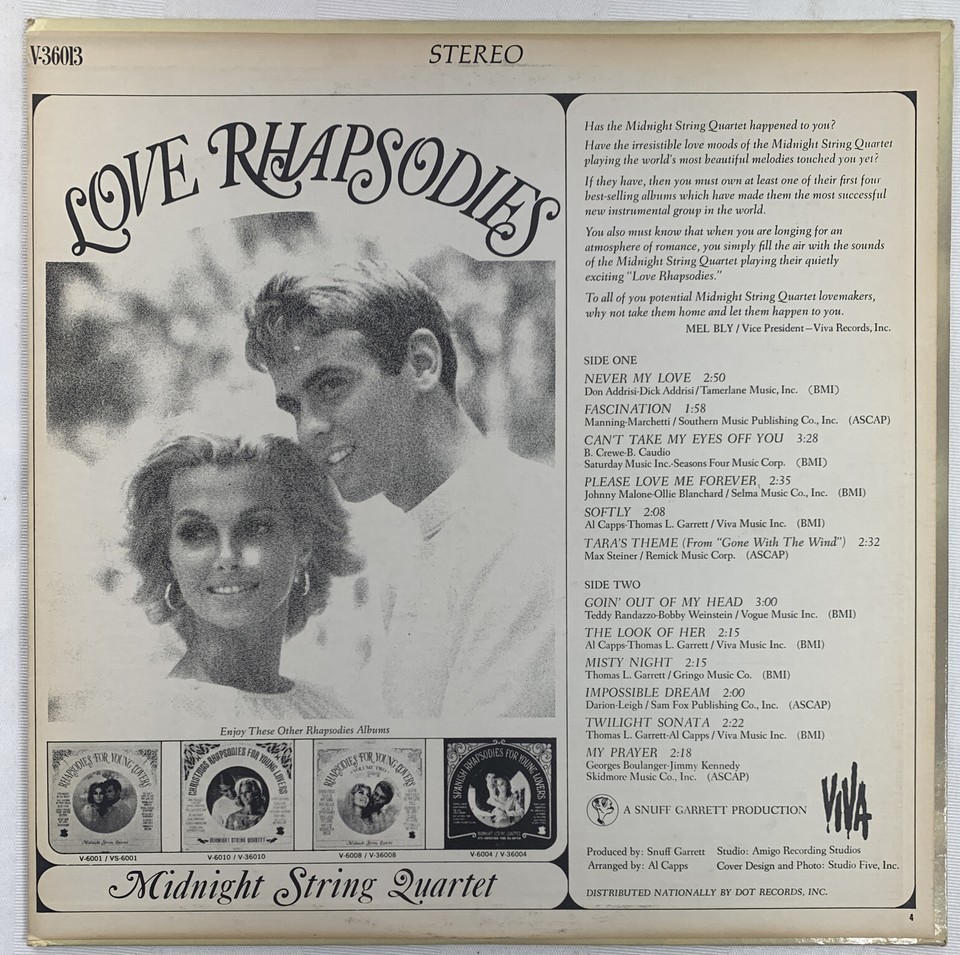 Midnight String Quartet Love Rhapsodies Record. Great deal on a fantastic looking old record. Cleaned and inspected before sale. Perfect for any audio enthusiast looking for a great hobby. Includes record and original sleeve.