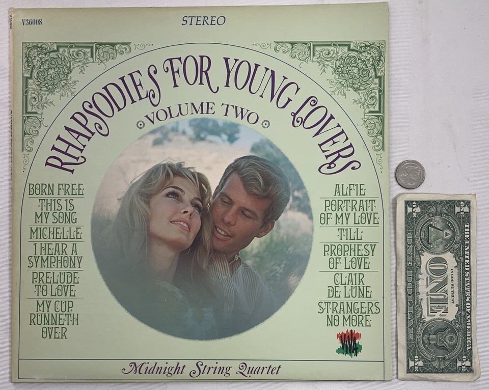 Midnight String Quartet Rhapsodies For Young Lovers Volume 2 Record. Great deal on a fantastic looking old record. Cleaned and inspected before sale. Perfect for any audio enthusiast looking for a great hobby. Includes record and original sleeve.