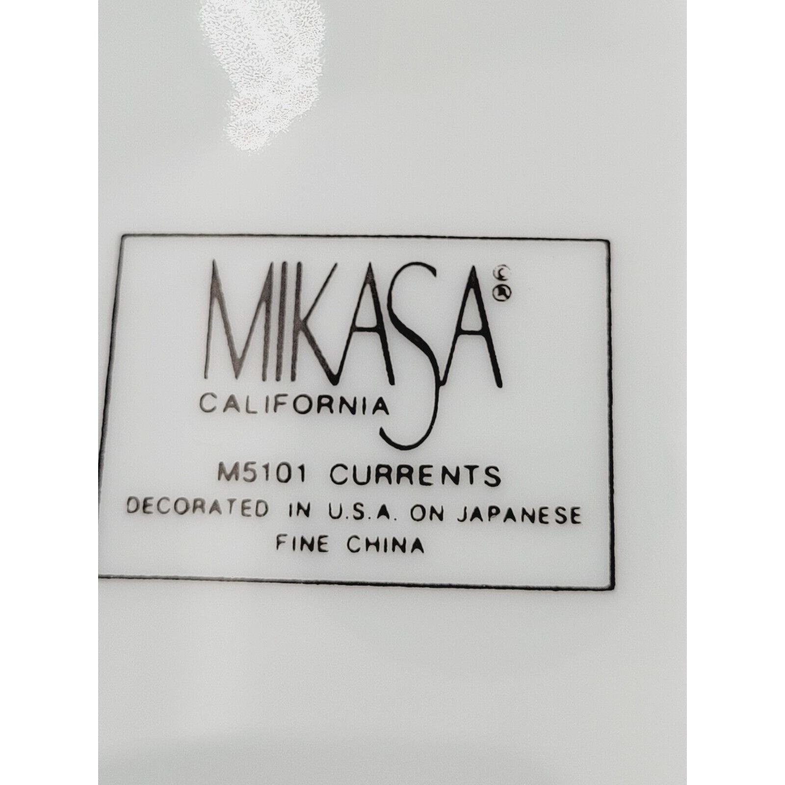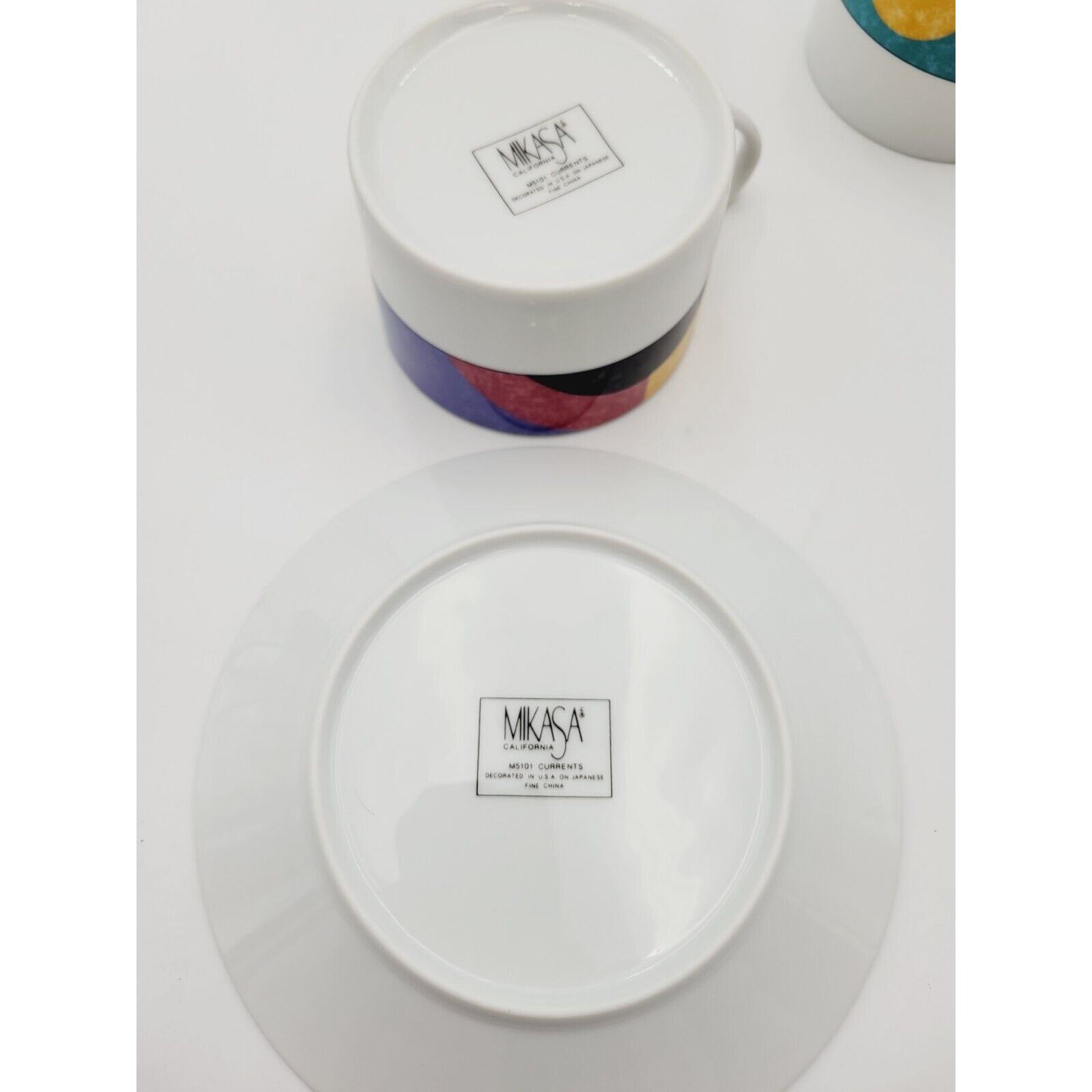 The Mikasa California Currents Cup Saucer Set includes two pieces featuring a Currents pattern, made of fine bone china in a white color with multi-color accents. The set is part of a four-piece collection and bears an impressed backstamp. This contemporary original tea cup and saucer set, model M5101, is from the brand Mikasa and is of Japanese origin. Ideal for serving tea or coffee, this elegant set adds a touch of sophistication to any dining experience.
