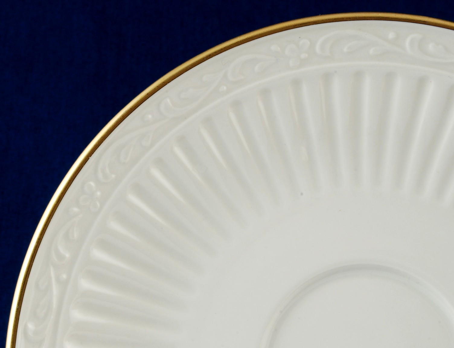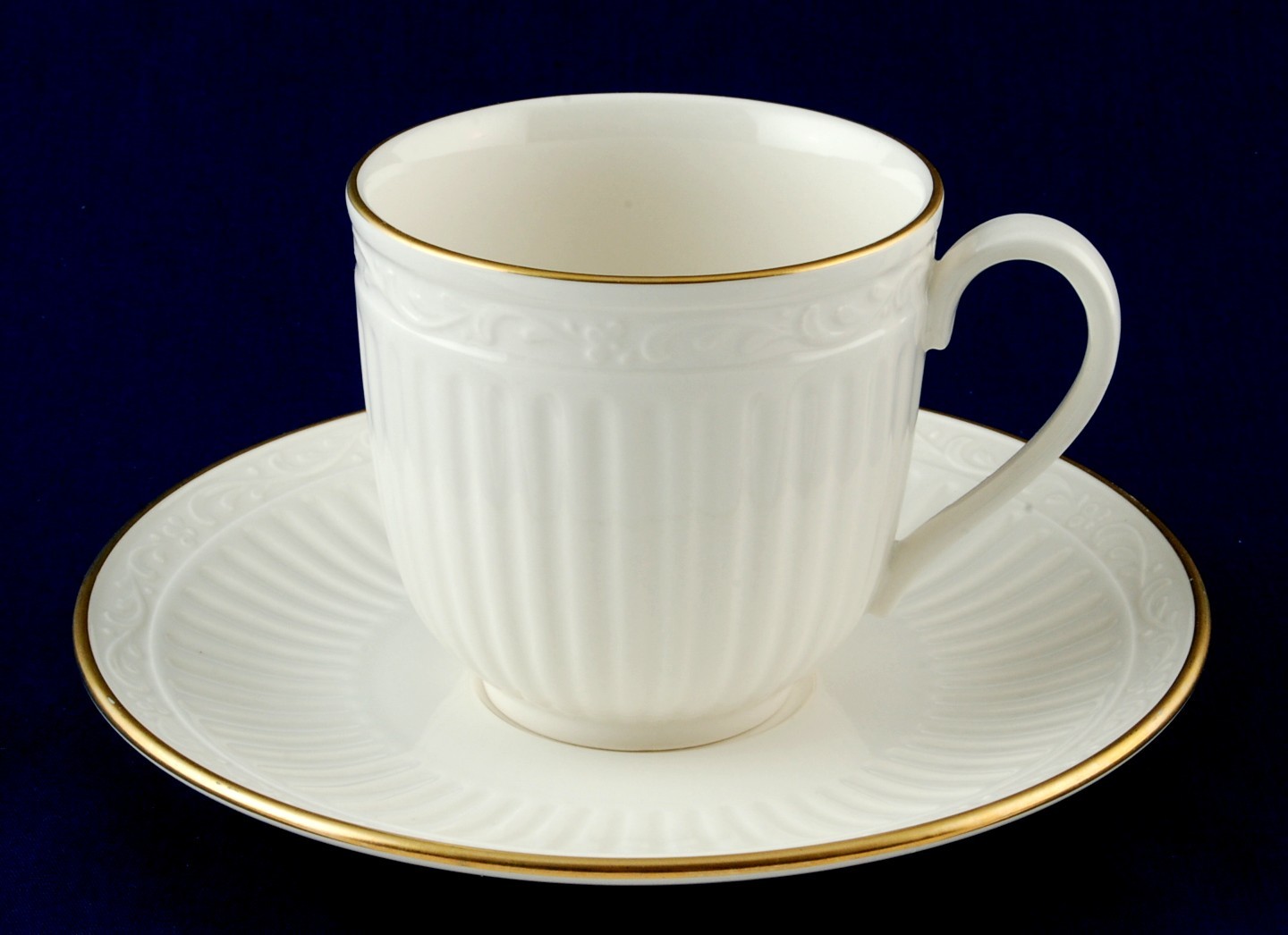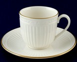 Mikasa Empire Gold, DD905, cup and saucer set in new condition. The pattern is ribs and embossed scrolling with gold trim. The saucer is 6-1/2 inches in diameter. The cup is 3 inches tall and 3-1/4 inches in diameter. This pattern was produced between 1996 and 2000.
