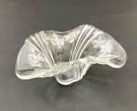 This is a beautiful Makasa clear glass bowl with frosted ivy leaf raised designs. The base of this stunning dish is a triangle. Flowing curves make this a great stand alone piece or background for holding candy. No chips or cracks.