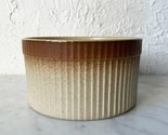 Vintage Mikasa Whole Wheat DX-100 stoneware souffle dish, crafted in Japan. Features a warm brown and beige two-tone glaze with a ribbed exterior and smooth interior. Classic and durable, perfect for both baking and serving.