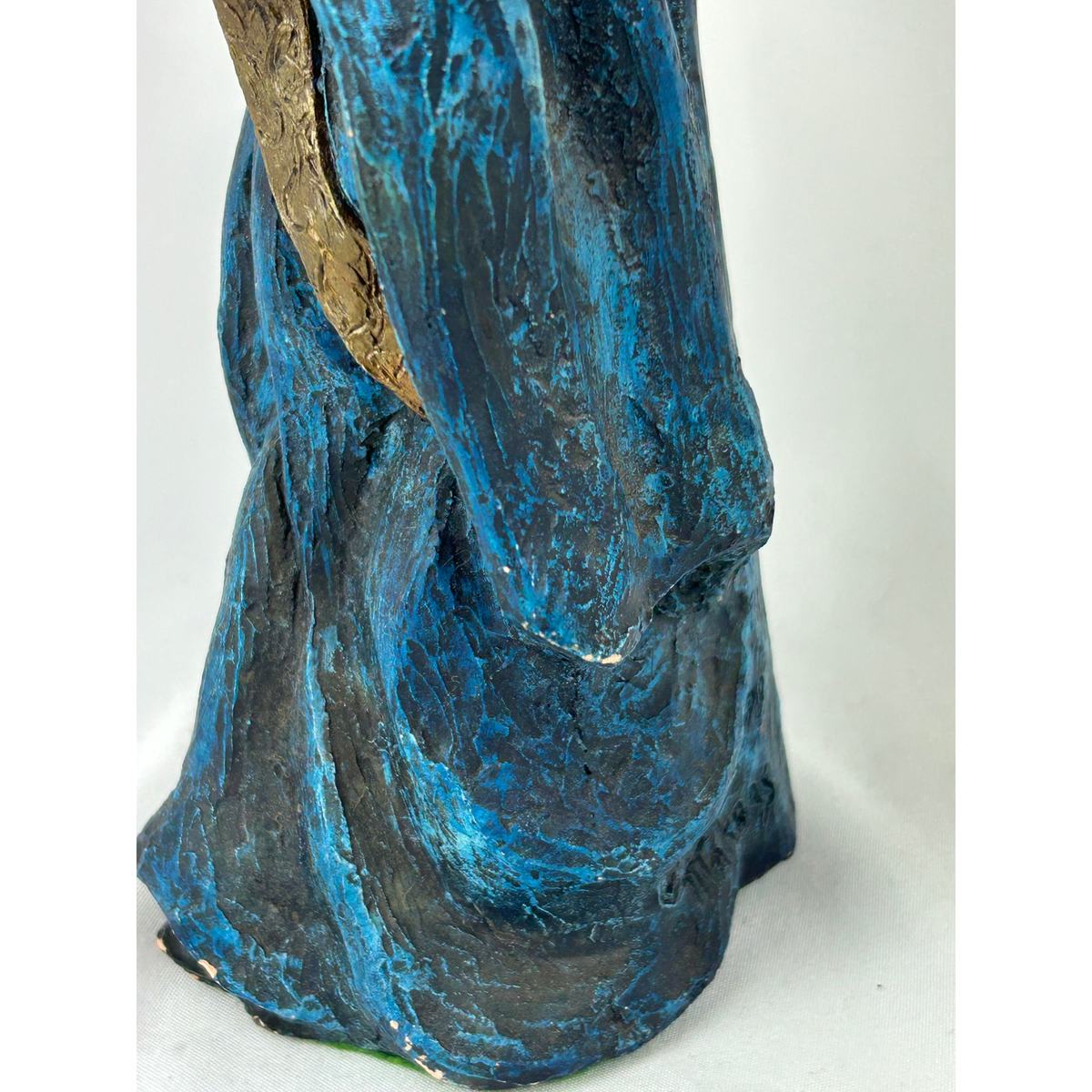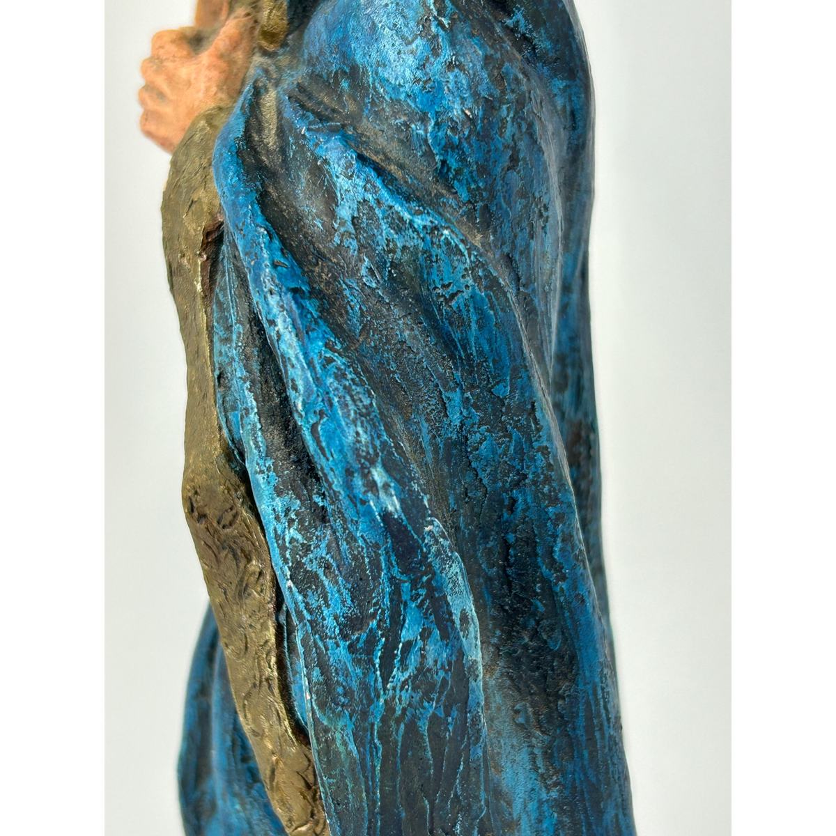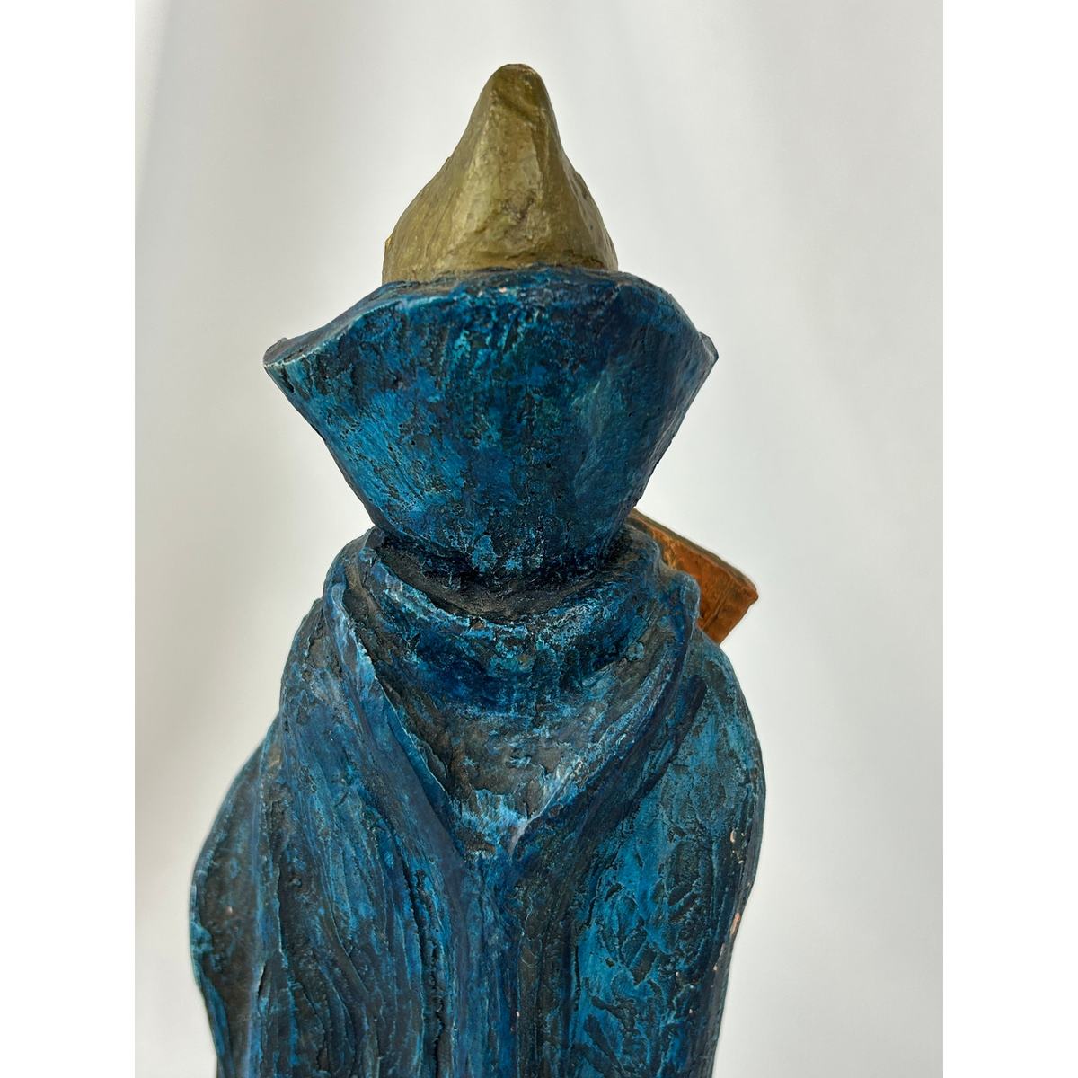 This striking 1979 sculpture of Saruman was handcrafted and signed by fantasy artist Mike Makras, one of the few independent craftsmen producing richly textured character figures during the late 1970s. The piece stands in a sweeping cobalt-blue robe, its folds carved with dramatic movement and depth. Saruman is portrayed in a moment of guarded contemplation, clutching an ornate spellbook to his chest while his arched brows and long white beard give him a commanding, almost watchful presence.