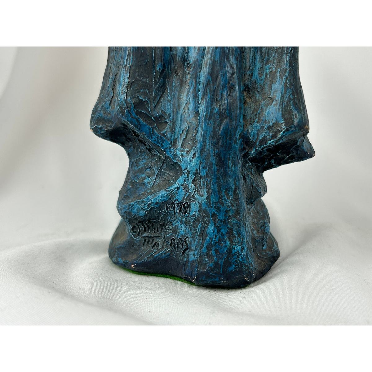 Makras? sculptural finish is unmistakable: layered pigments, bold contrast, and a tactile surface that reads like carved stone touched with patina. The pointed helm, ornamental sleeve panels, and engraved book cover all display intentional, early-fantasy design sensibilities that collectors of Tolkien-inspired art will immediately recognize. The underside bears the original cast inscription and 1979 date, confirming this as one of the artist?s early-period works.