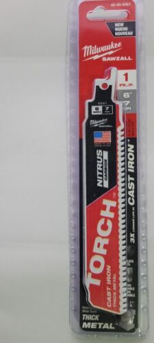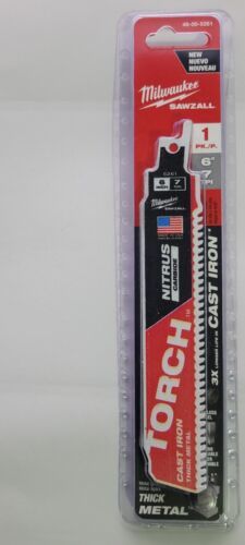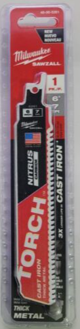 You are Buying Brand New And Factory Sealed Milwaukee 6 in. 8 TPI TORCH Nitrus Carbide Teeth Metal Cutting SAWZALL Reciprocating Saw Blade Model #48-00-5261 .... with 25% more Nitrus Carbide per tooth and a universal tang, The TORCH SAWZALL blade with NITRUS CARBIDE is designed to cut the thickest metals like cast iron and soil pipe. With the unique carbide, it also outperforms standard carbide teeth blades in common thick metals.