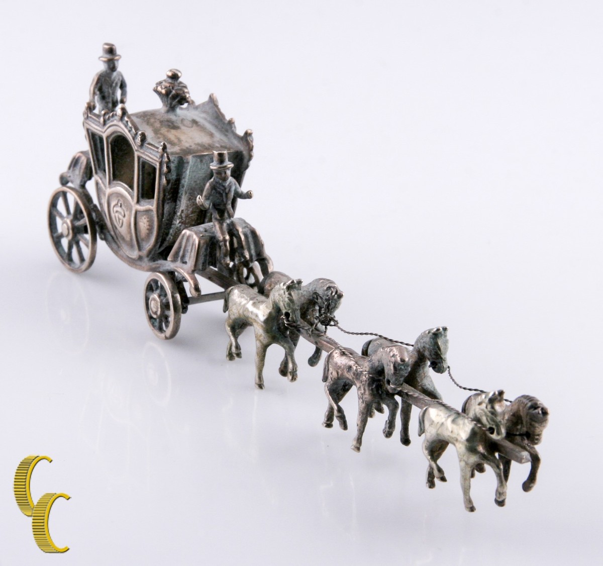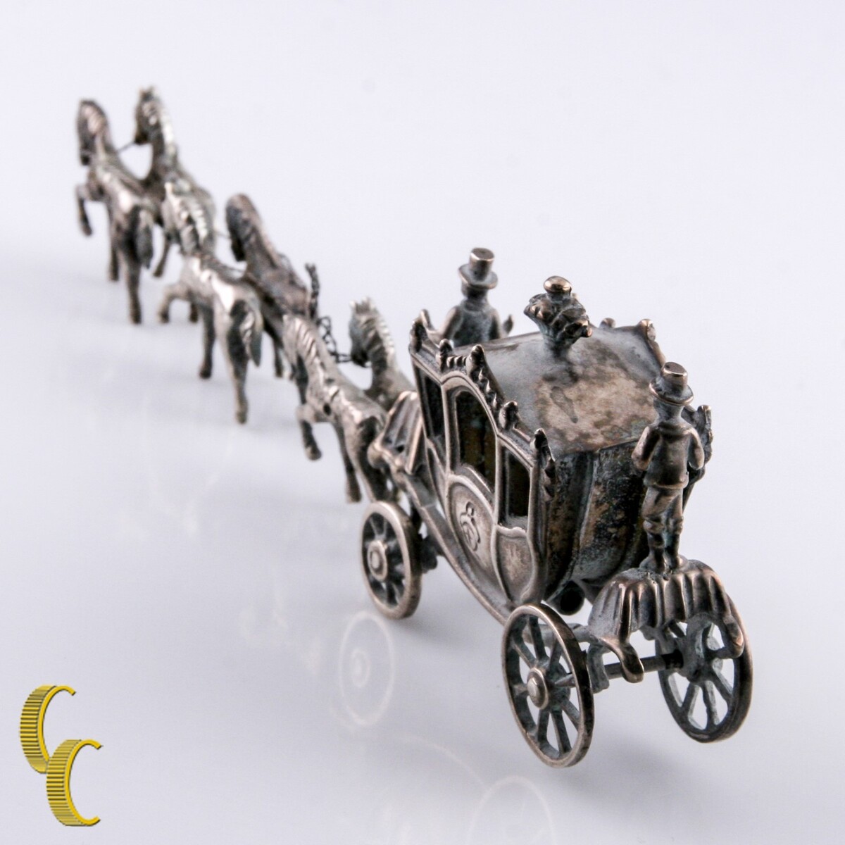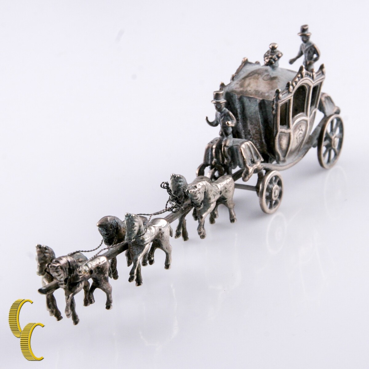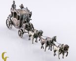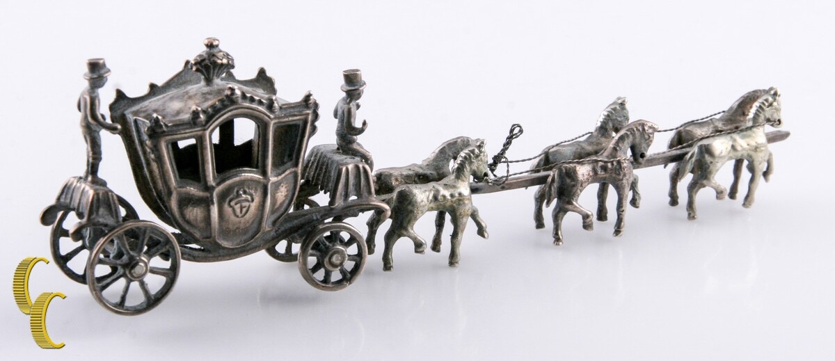 Uomini in miniatura con cavalli e carreggiata figurina da bambola vintage d'argento